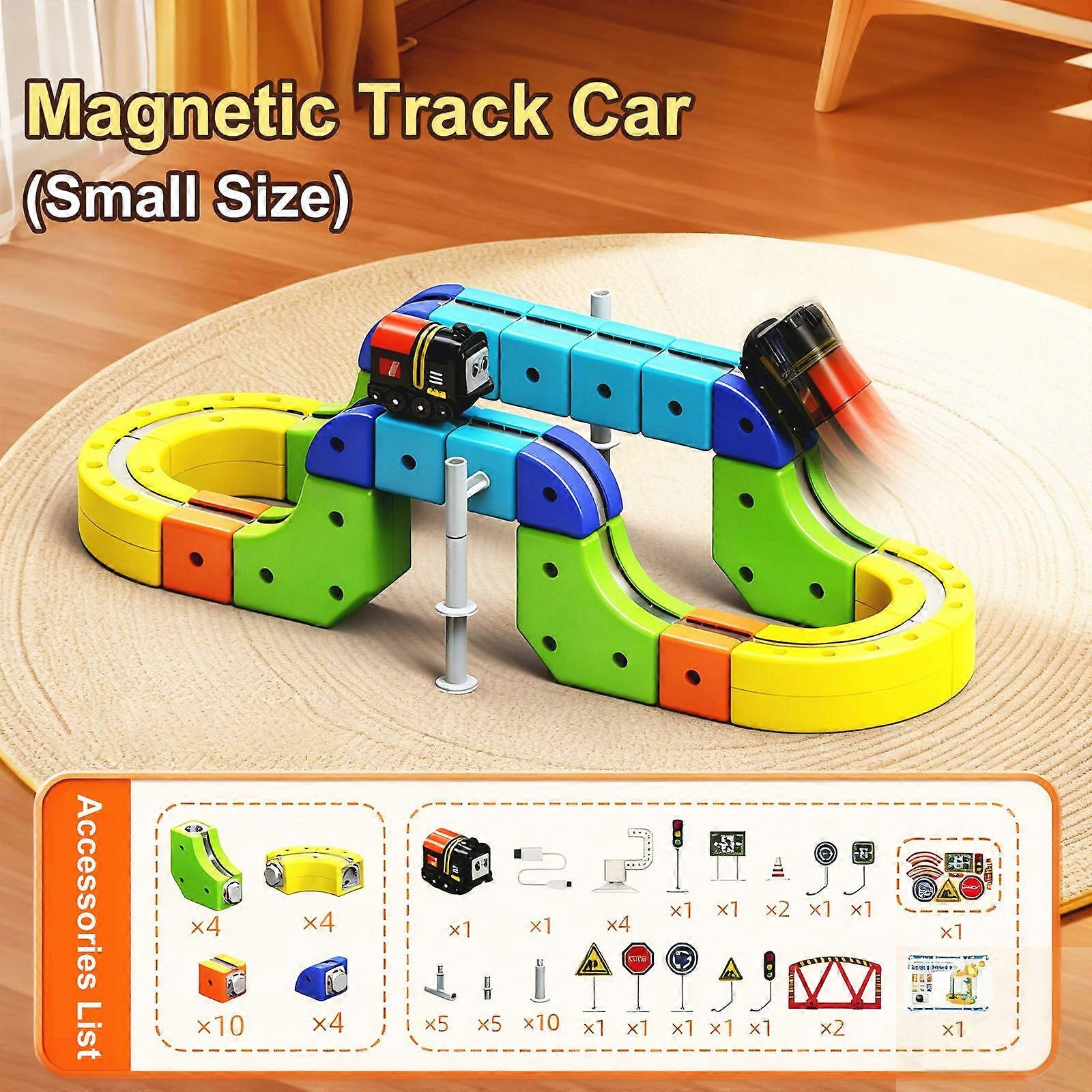 Features: 1. Magnetic Connection Design: The train and tracks feature powerful built-in magnets for secure, stable linking that resists accidental disassembly during play. 2. Gravity Defying Structure: Supports vertical, upside-down, and looping track configurations to stimulate spatial reasoning and creative thinking in children. 3. Multiple Assembly Combinations: Offers endless layout possibilities with modular pieces, encouraging imaginative play and cognitive development through diverse track designs. 4. Electric Powered Operation: Equipped with a rechargeable motorized train that runs smoothly and quietly on its own, enhancing interactive play without manual pushing. 5. Safe And Durable Materials: Made from high-quality ABS plastic with smooth edges and certified to meet international safety standards, ideal for kids aged 3 and up. Specifications: Material: ABS Plastic + Built-in Magnets Size: 35*29*8 cm(62pcs),40*30*8cm(105pcs),38*26*6.5cm(167pcs) Recommended Age: 3+ Years Include: 62pcs/Set * Magnetic Track Train Toy Or 105pcs/Set * Magnetic Track Train Toy Or 167pcs/Set * Magnetic Track Train Toy