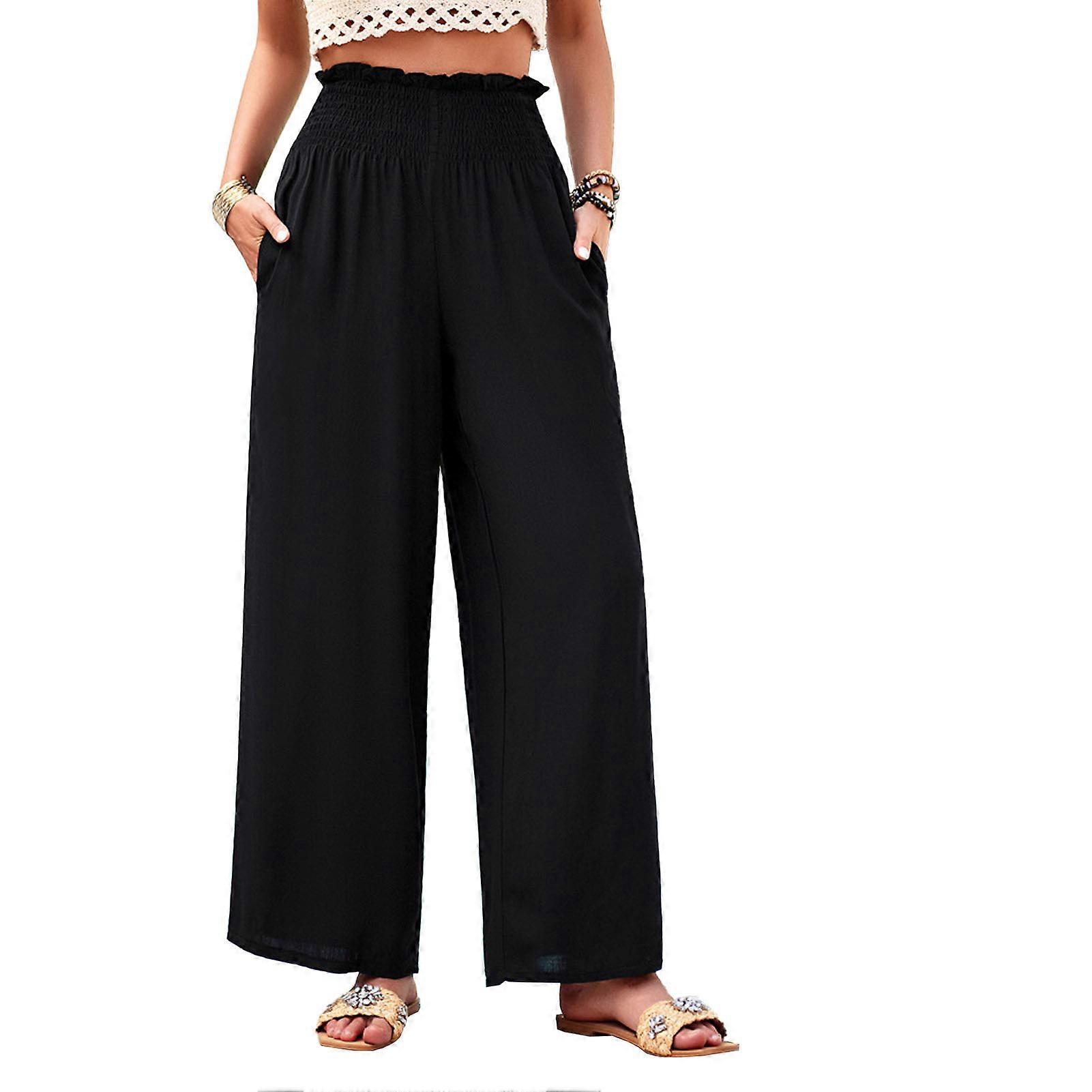 Women Shirred Wide Leg Pants Solid Color Pockets Loose Casual Black S