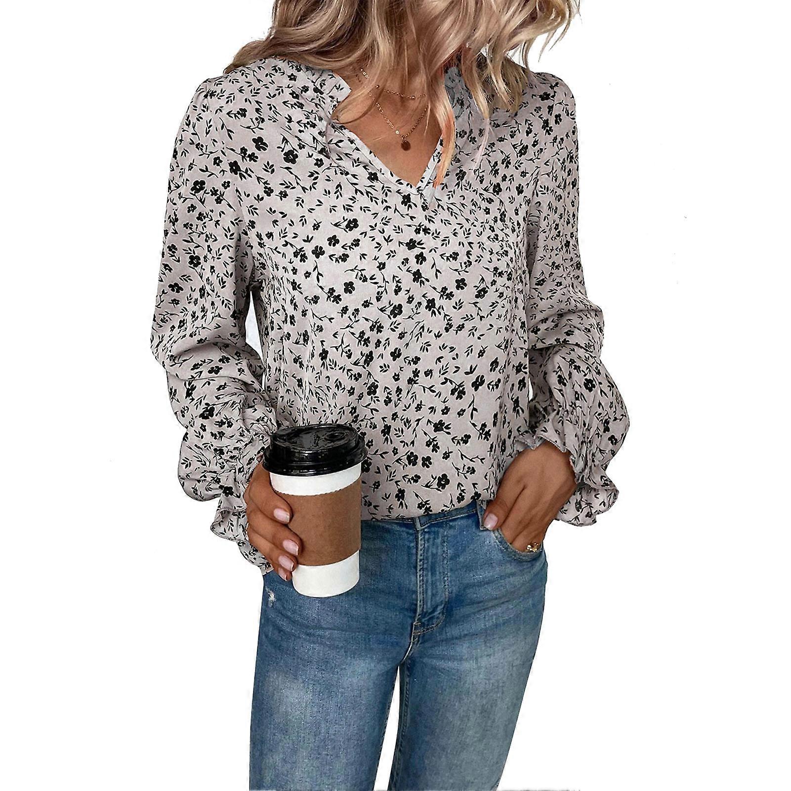V Neck Ruffle Long Sleeve Floral Blouse Party Leisure Grey L