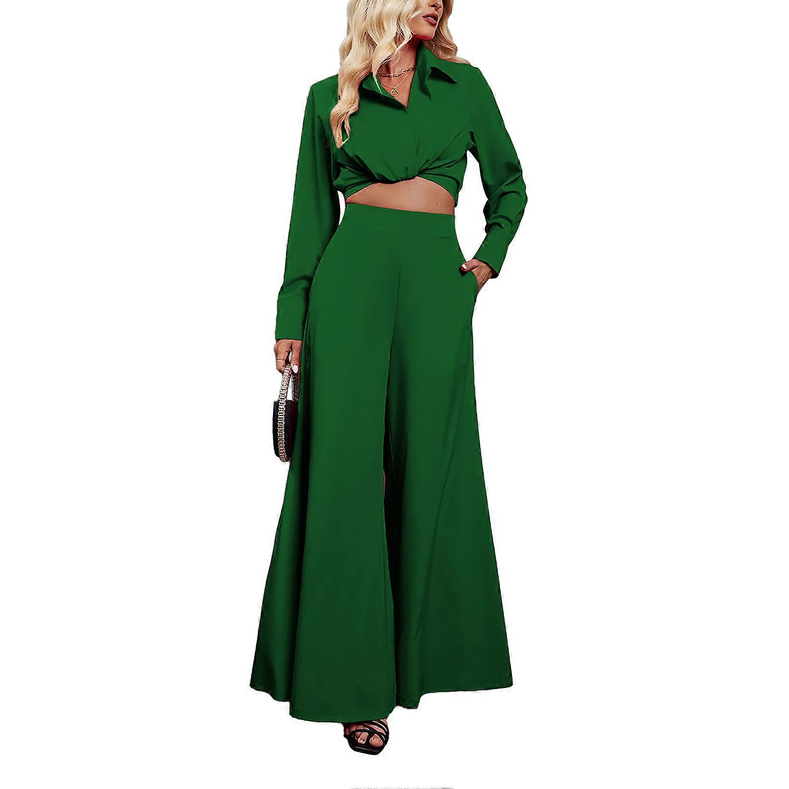 2 Piece Long Sleeve Wide Leg Trousers Set Green M