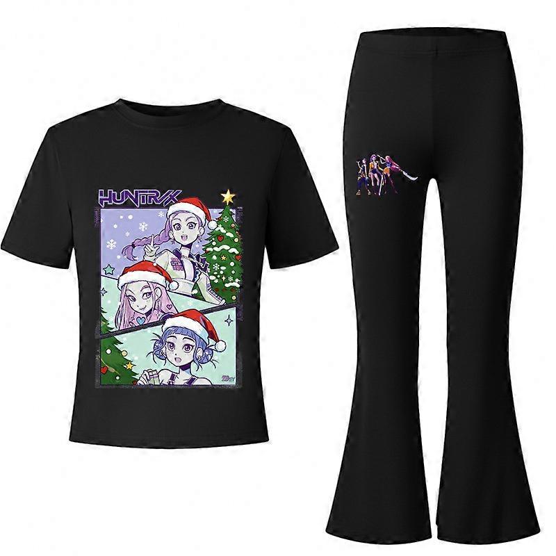 Flower Pattern 2- Black- Witch Hunter's Big Kids Summer Short-Sleeved T-Shirt + Flared Long Pants Fashionable Casual Set