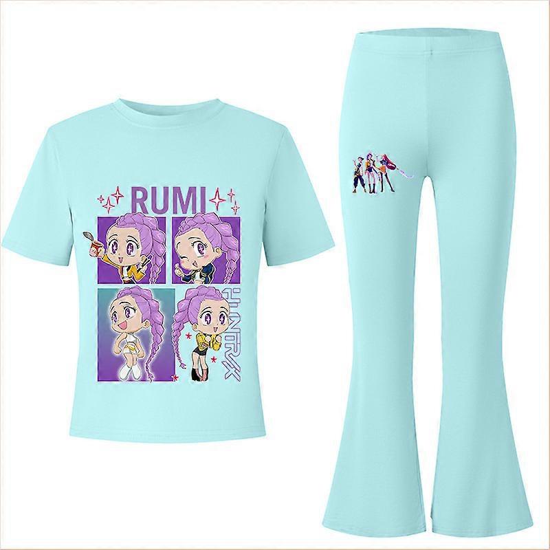 Flower Pattern 2- Light Blue- Witch Hunter's Big Kids Summer Short-Sleeved T-Shirt + Flared Long Pants Fashionable Casual Set