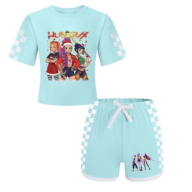 Flower Pattern 2- Light Blue- Witch Hunt Boys And Girls Children's T-Shirt + Shorts Printed Sports Pajamas Children's Set