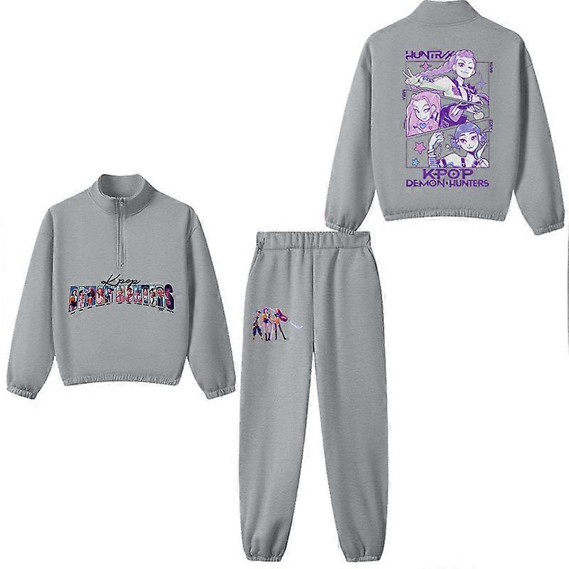Grey- Demon-Hunting Girl Group Boys' And Girls' Stand Collar Half-Zip Sweatshirt With Pants, Fleece Casual Kids' Tracksuit