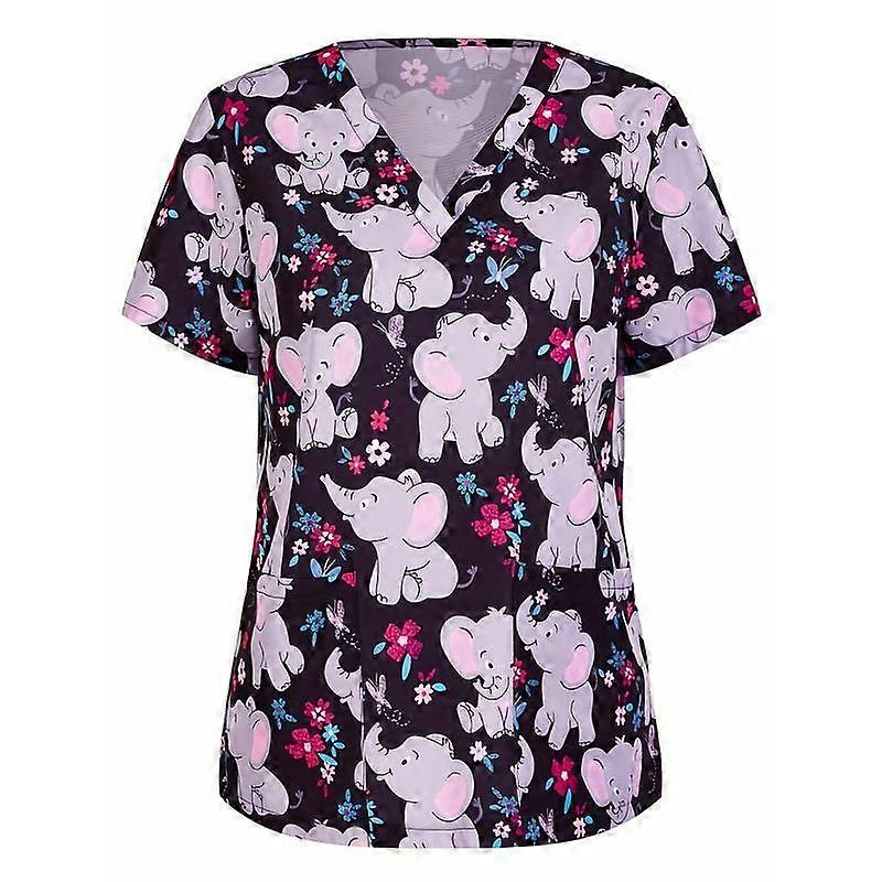 Women's Chic Elephant Print V-Neck Scrub Top - Casual Short Sleeve Design with Handy Patched Pockets - Comfortable & Stylish Nurse Uniform f