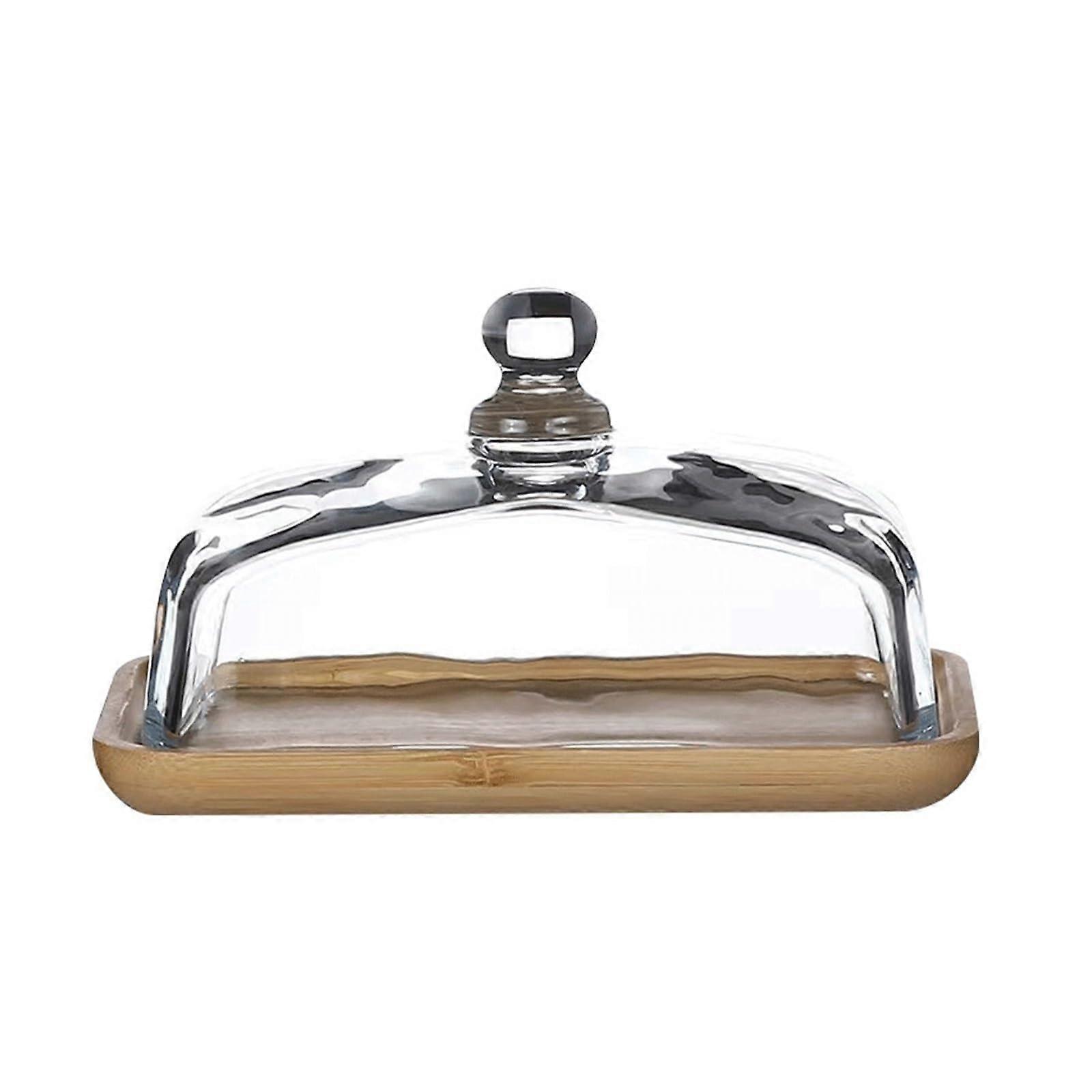 Butter Dish with Lid Airtight Glass Keeper on Elegant Wooden Tray for Kitchen and Table