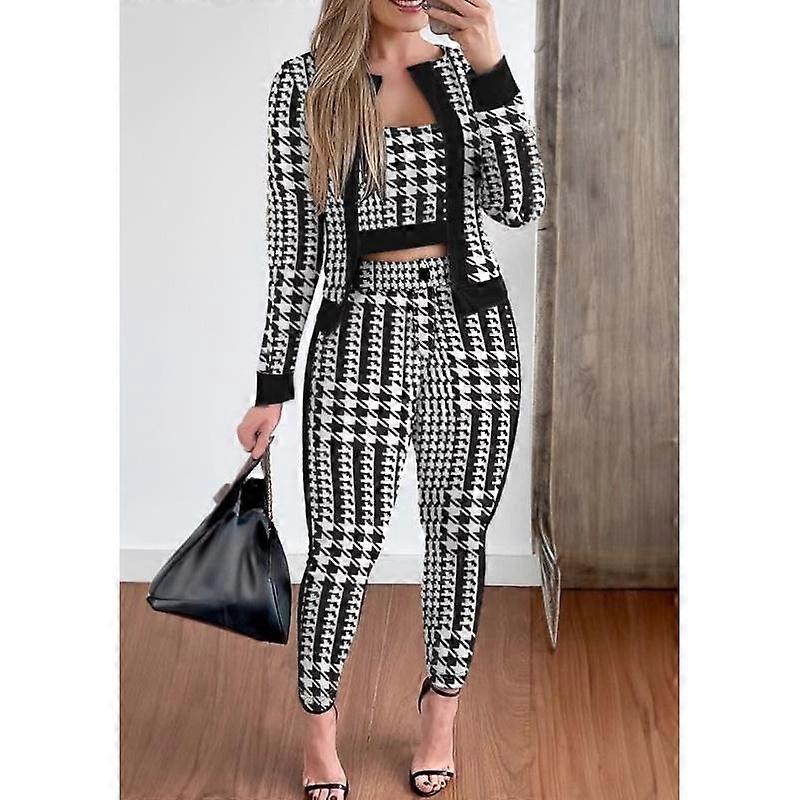 Thousand Bird Pavilion Women's Geometric Print Long Sleeve Blazer & Above the Ankle Leggings Set - OL Style Fitted Clothing for Summer Casua