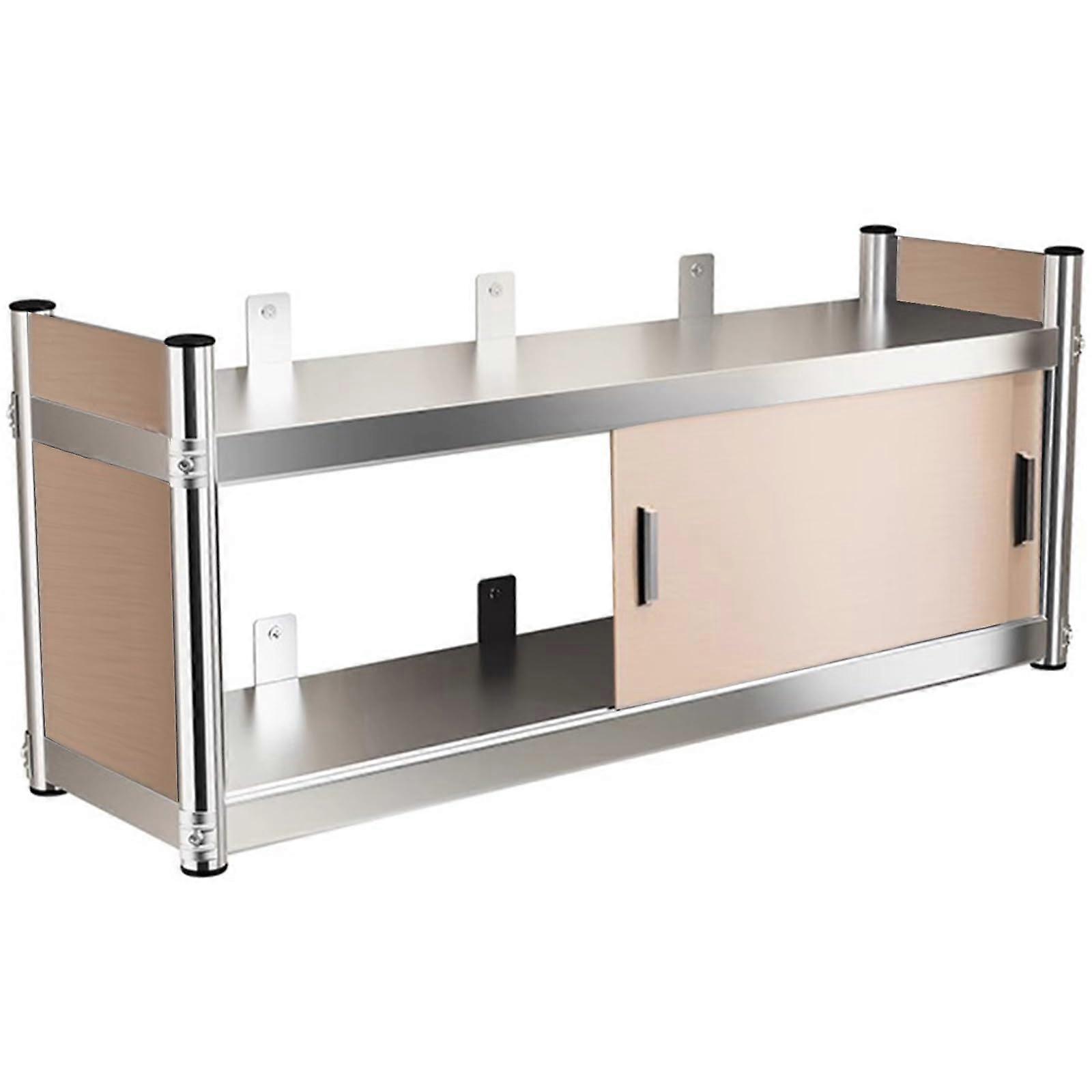 Stainless Steel Storage Shelf with Sliding Doors Durable Stainless Steel Construction Built from thickened stainless steel with a brushed finish for a smooth, shiny appearance. Resistant to rust and easy to maintain — simply wipe clean with a cloth. Strong and longlasting design ensures years of reliable use. Practical Sliding Door Cabinet Enclosed cabinet design with sliding doors keeps cookware, tableware, and supplies protected from dust and contaminants. Ideal for maintaining cleanliness and organization in busy kitchens and workspaces. Generous TwoTier Storage Capacity Two spacious shelves provide ample room for storing kitchen essentials, restaurant equipment, or workshop tools. Helps reduce clutter and frees up valuable counter space, allowing for a more efficient work environment. Strong LoadBearing Performance Features sturdy steel tubing with a 1.25inch (32 mm) diameter and shelf panels with a thickness of 1.06 inches (27 mm). Total weight capacity is 40 kg (88.18 lbs), with each shelf capable of supporting up to 20 kg (44.09 lbs). Versatile Usage Across Various Settings for kitchens, bathrooms, laundry rooms, or bedrooms. Can hold microwave ovens, small appliances, dishware, spices, condiments, canned goods, bottles, and cookware. Suitable for both residential and commercial use. Example Scenarios: 1. In a home kitchen, use the shelves to store pots, pans, and everyday cooking ingredients while protecting them from dust and moisture. 2. In a restaurant setting, keep utensils, serving dishes, and prep tools organized for quick access during busy service hours. 3. In a laundry room, store detergents, cleaning supplies, and folded linens neatly out of sight. This stainless steel shelf combines durability, ample storage, and versatile functionality, making it a practical solution for organized, efficient living and working spaces.