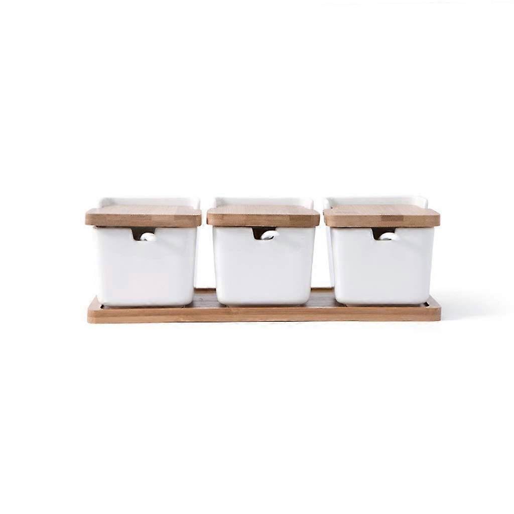 Seasoning Box Handmade Borosilicate Glass Jar with Lid and Spoon on Wood Base for Kitchen Use