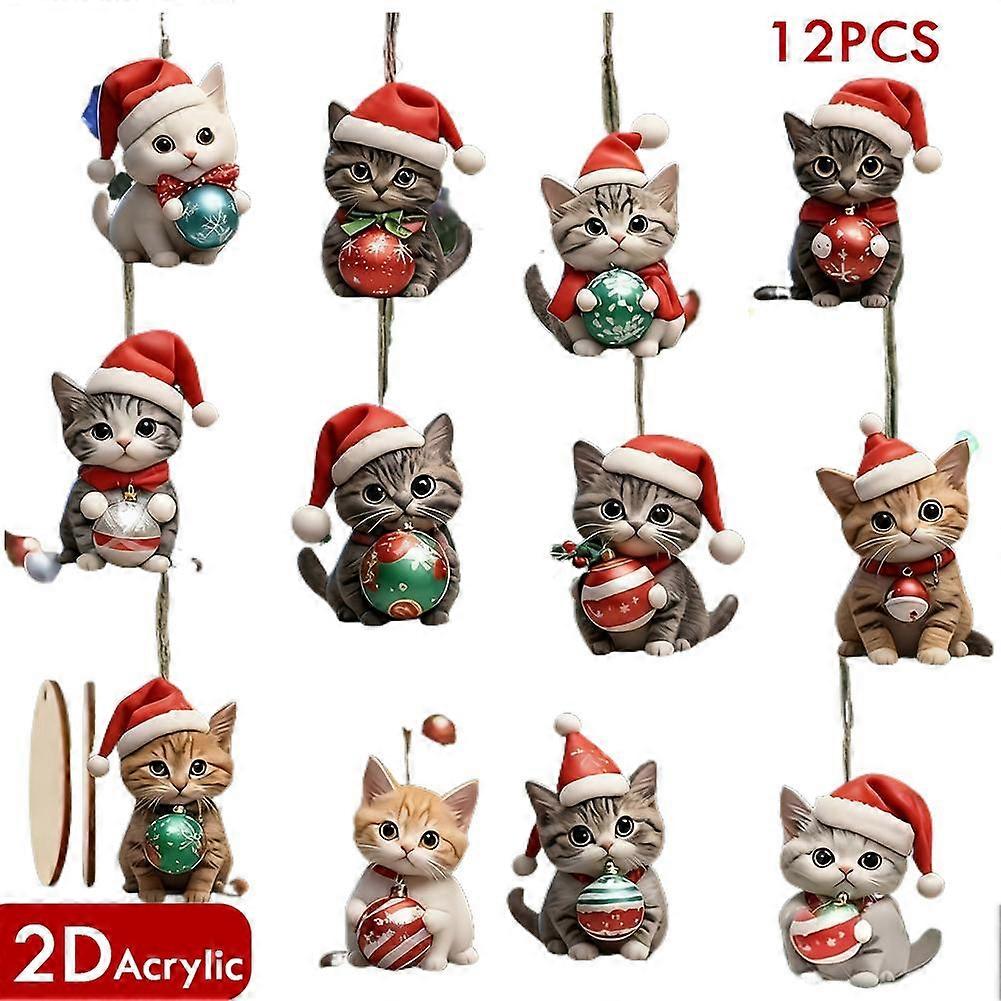 Christmas Cat Acrylic Decoration 12pcs Set 2D Plane Design Festive Tree Ornaments Holiday Home Party Decor