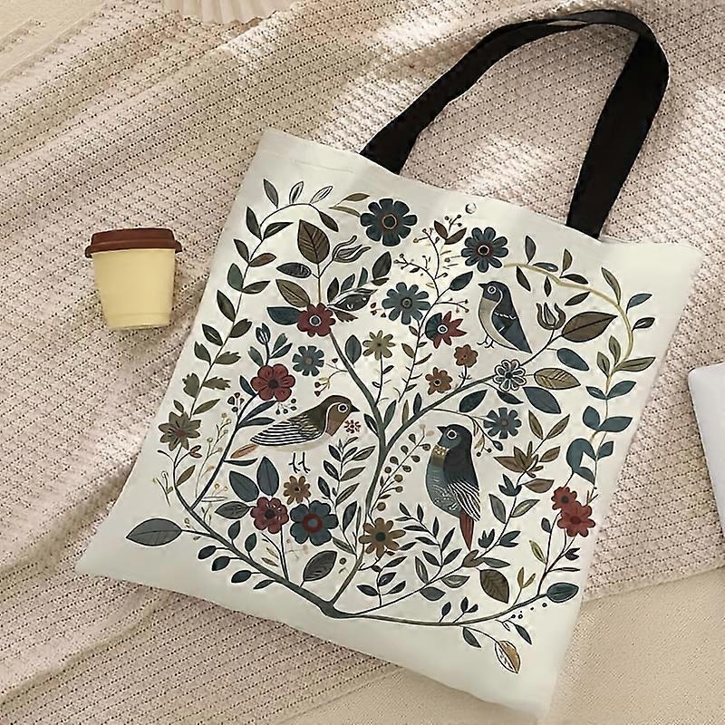 Reusable Multifunctional Tote Bag with Bird Floral Leaf Print Polyester Snap Closure Shoulder Bag for Women Shopping Ba