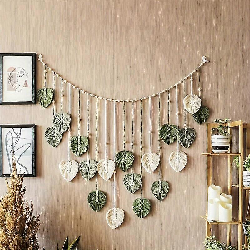 Handwoven Bohemian Macrame Wall Hanging with Wood Beads & Leaves Tassel Photo Holder Decor for Bedroom Living Room Nursery