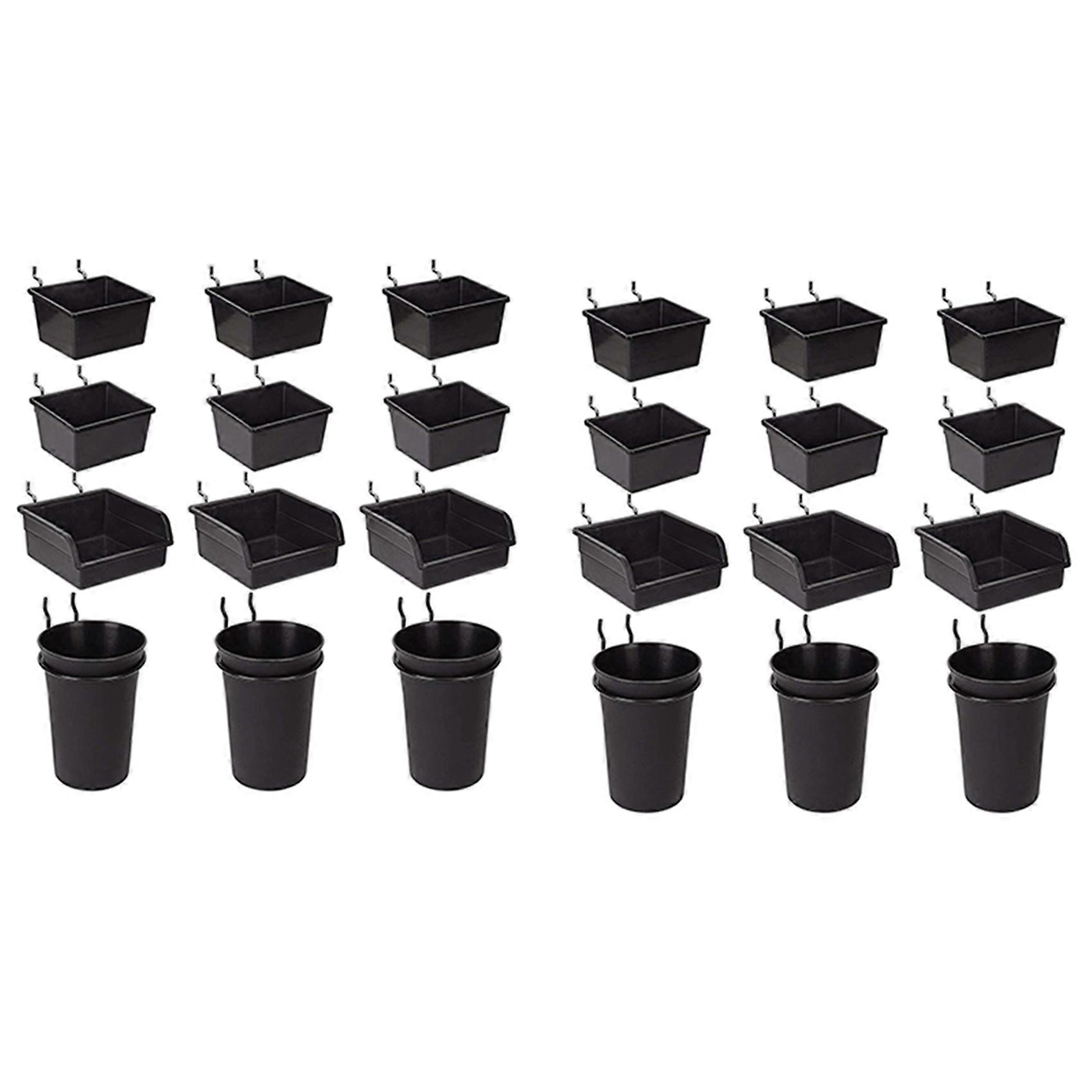 [Convenient Metal Hooks] More easy to install or disassemble these pegboard sets, not need to access the back of your pegboard, accurate hardware size. Universal Fit for 1/8 inch and 1/4 inch pegboards with 1 inch spacing. With angled hooks attachment, more stable locked into pegboard holes, bins and cups will always sit on the board well, never falling out when usage. [Heavy Duty Multi-pack] Bins, trays, and cups made from high-density hard plastic, hooks, and hoops made from high-quality thickening Metal, sturdy and durable, anti-rust plated finish. Note: the pegboard is not included! [Utility Pegboard Holders] These multipurpose storage holders could be arranged in a compact style, achieving great space-saving demand, get effortless accessible for a variety of small hardware, no more searching for things among the clutter. [Works Widely] Perfect for organizing pliers, drills, pencils, painting brushes, wrenches, screws, nuts, bolts, nails, clips, and other arts and crafts accessories. Redesign your organizing ways, hang up everything on your shelving boards. Could be used for workshop, retail shop shelving, garage workbench, pantry, shed pegboard wall, craft desk, hobby rooms - great storage solutions for small business owners. [Minimalist Style] Maximize the use of a pegboard wall displays, keep odds and ends at hand, you will know where they are and always within arms reach, keeping your space clean, neat, and orderly. Match pegboard of different color well, and looking modern. Material:Plastic + Metal colour:black Package Contents: 12 * small storage box (9x7x4.5cm) 6 * large storage box (10x10x5cm) 6 * storage bucket