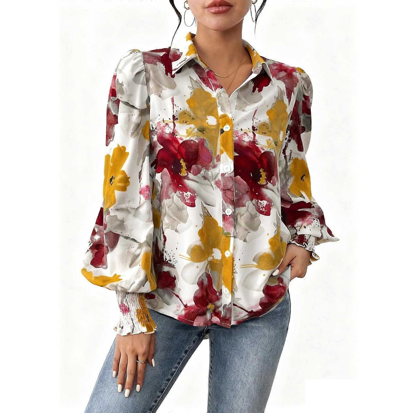 Womens Fall Fashion Button Down Shirts Loose Fit Floral Print Blouses Dressy Casual Tops Trendy Tee Shirt red and yellow XL