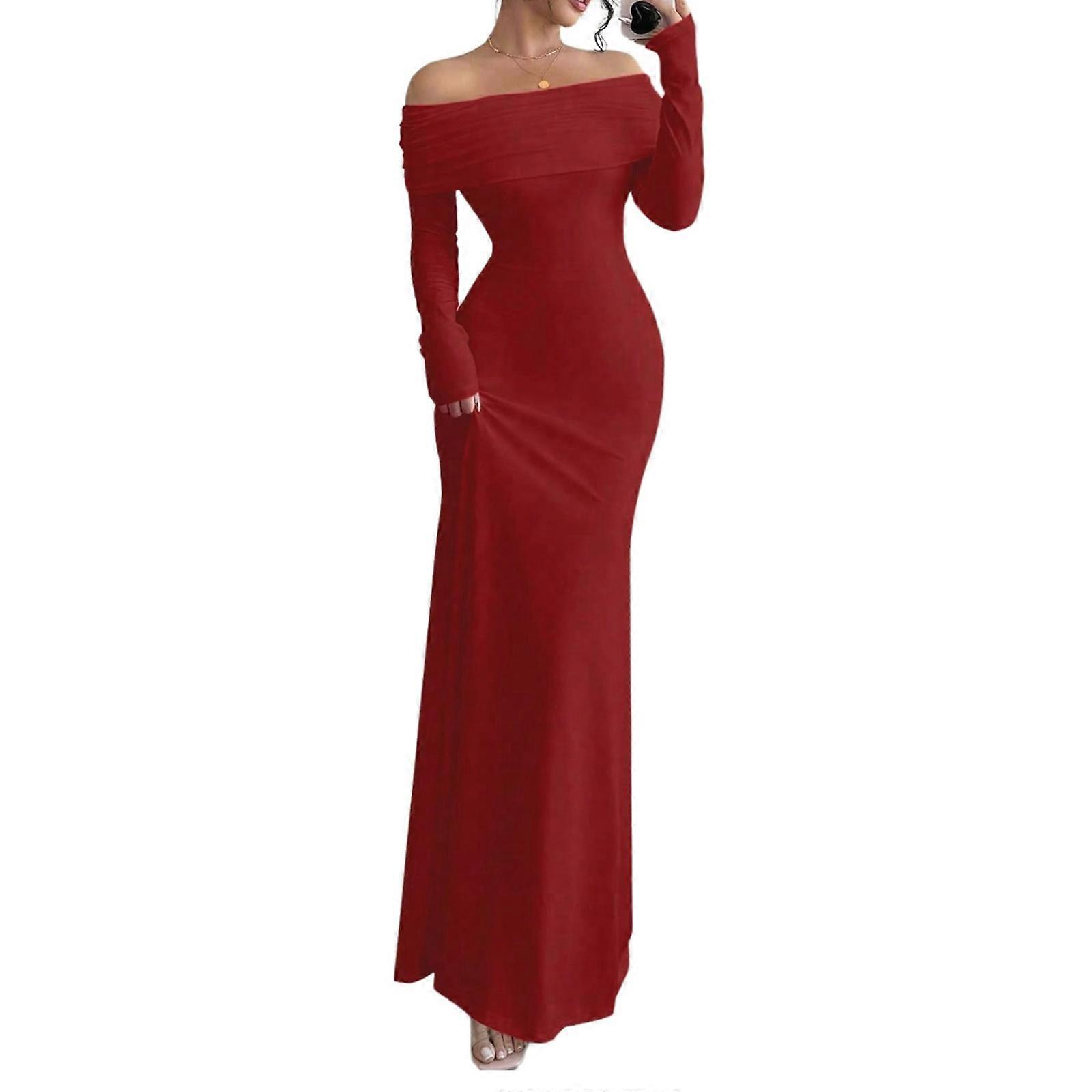 Women's Long Sleeve Off The Shoulder Bodycon Dress Elegant Maxi Dress Cocktail Prom Dresses Burgundy XL