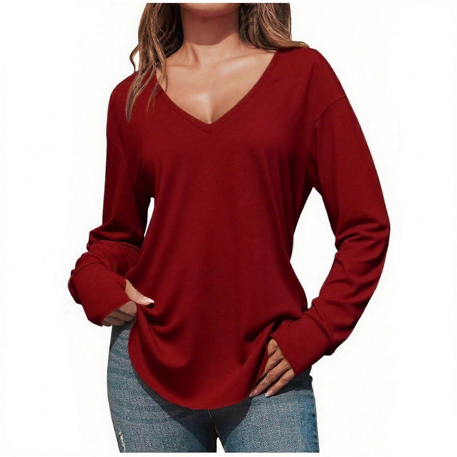 Long Sleeve Shirts for Women Trendy Fall Fashion Dressy Casual Loose V Neck Blouses Basic Tops with Thumb Hole Claret XL
