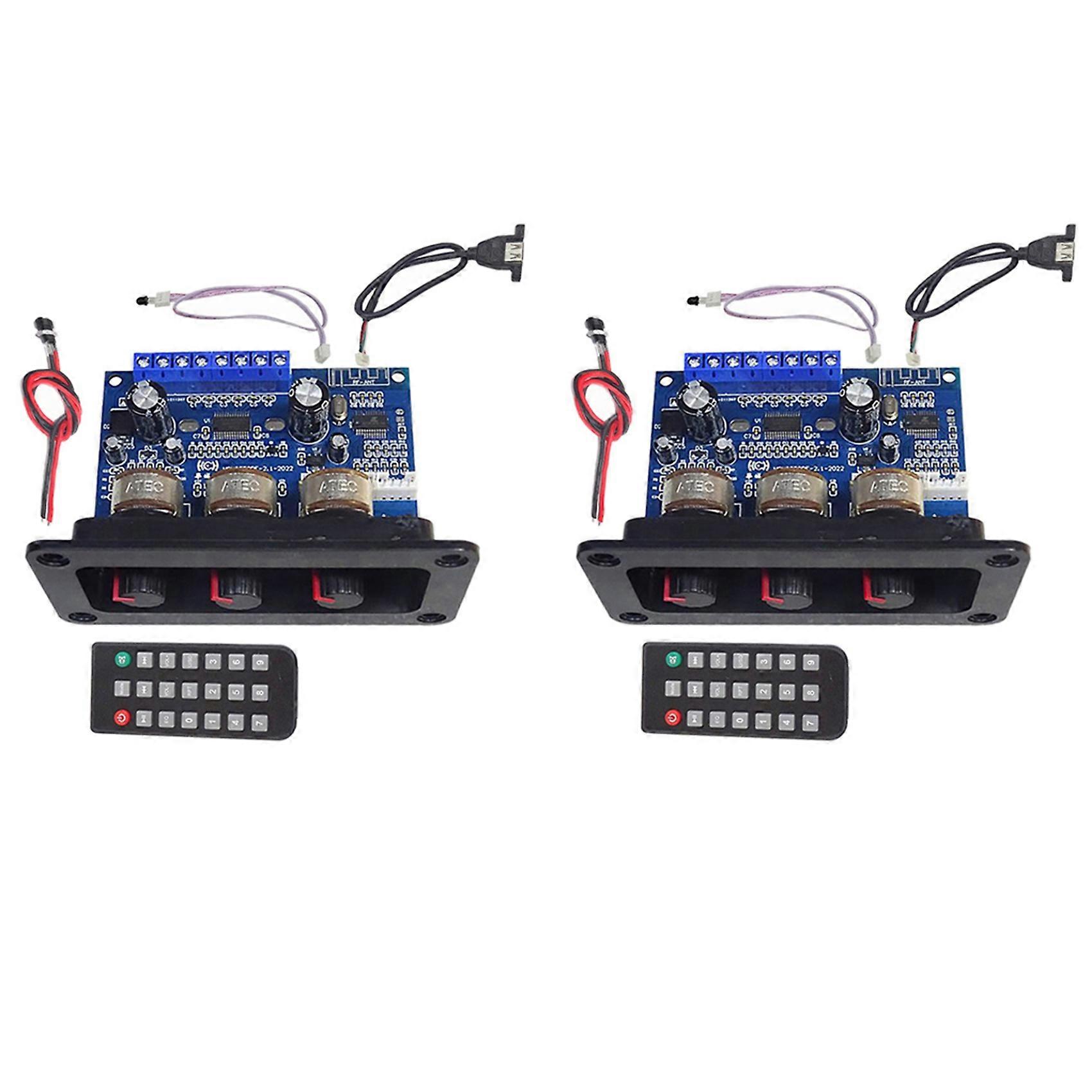 Product name: 2.1 channel subwoofer power amplifier board Supply voltage: 12-20V DC Supply current: 3-5A Maximum power: 2 x 25W+50W 8 ohm Minimum power: 2 x 15W+30W 4-8 ohm Bluetooth version: 5.0 Channel: 2.1 Job type: Class D Product size: 96x48mm Colour: black + blue Material: PCB + metal Package Contents: 2 x Bluetooth power amplifier board 2 x DC female cable 2 x USB cable 2 x Remote control
