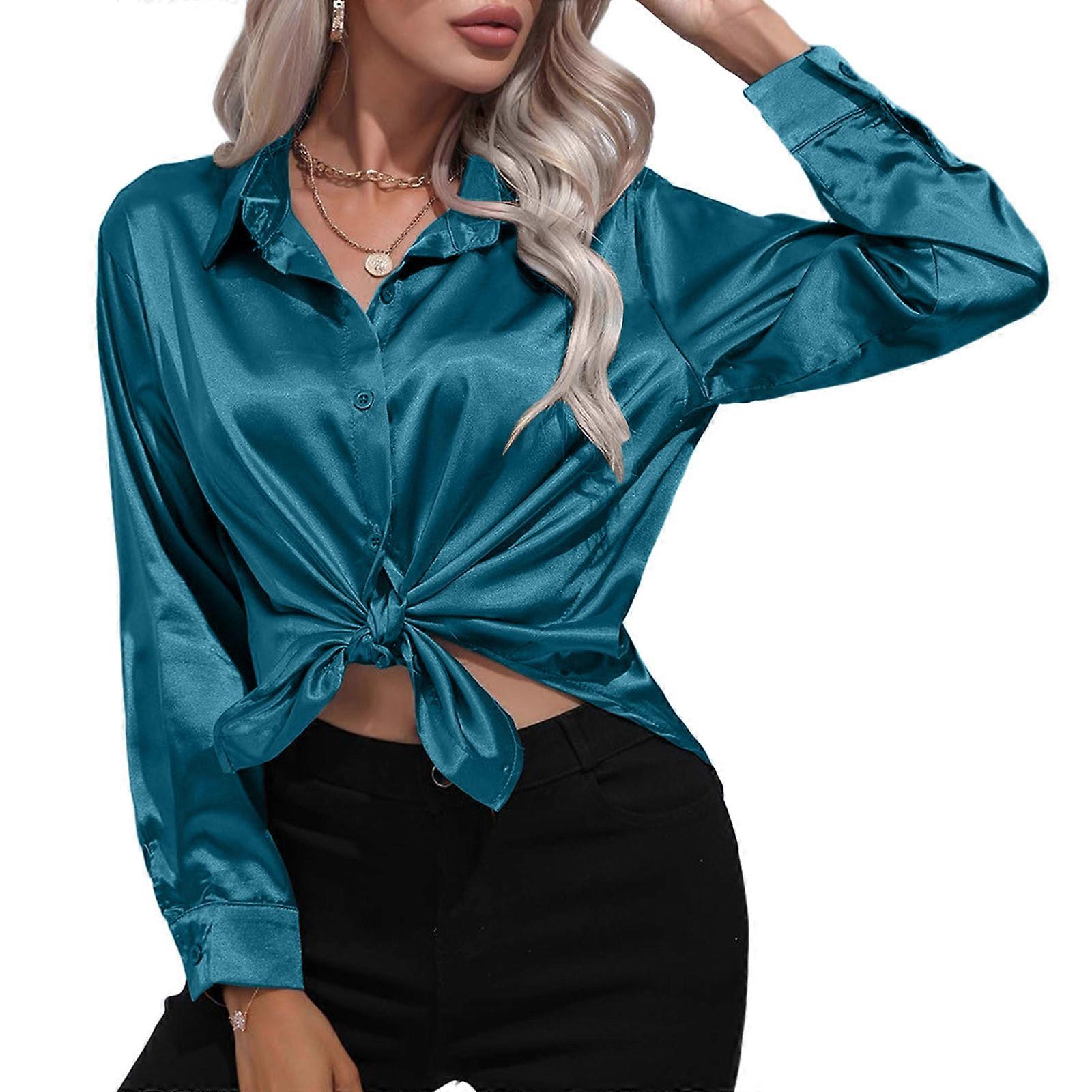 Women's satin blouse, casual style, long sleeves, button closure, silk fabric, suitable for business, work, and belted outerwear. Royal Blue XL