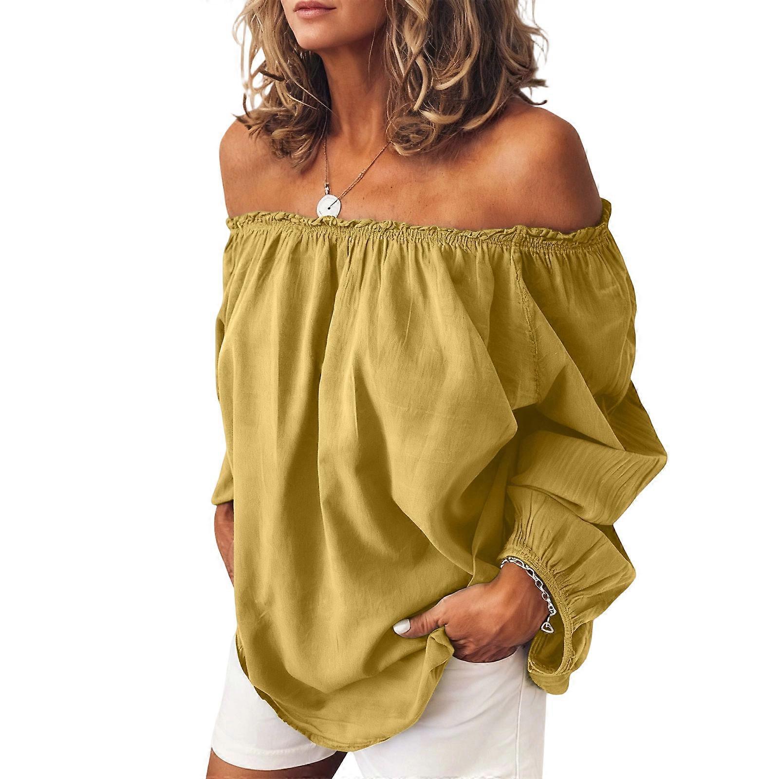 Womens Off Shoulder Tops Linen Cotton Tunic Tops Long Sleeves Ruffle Balloon Sleeve Shirts Casual Blouses Yellow XL
