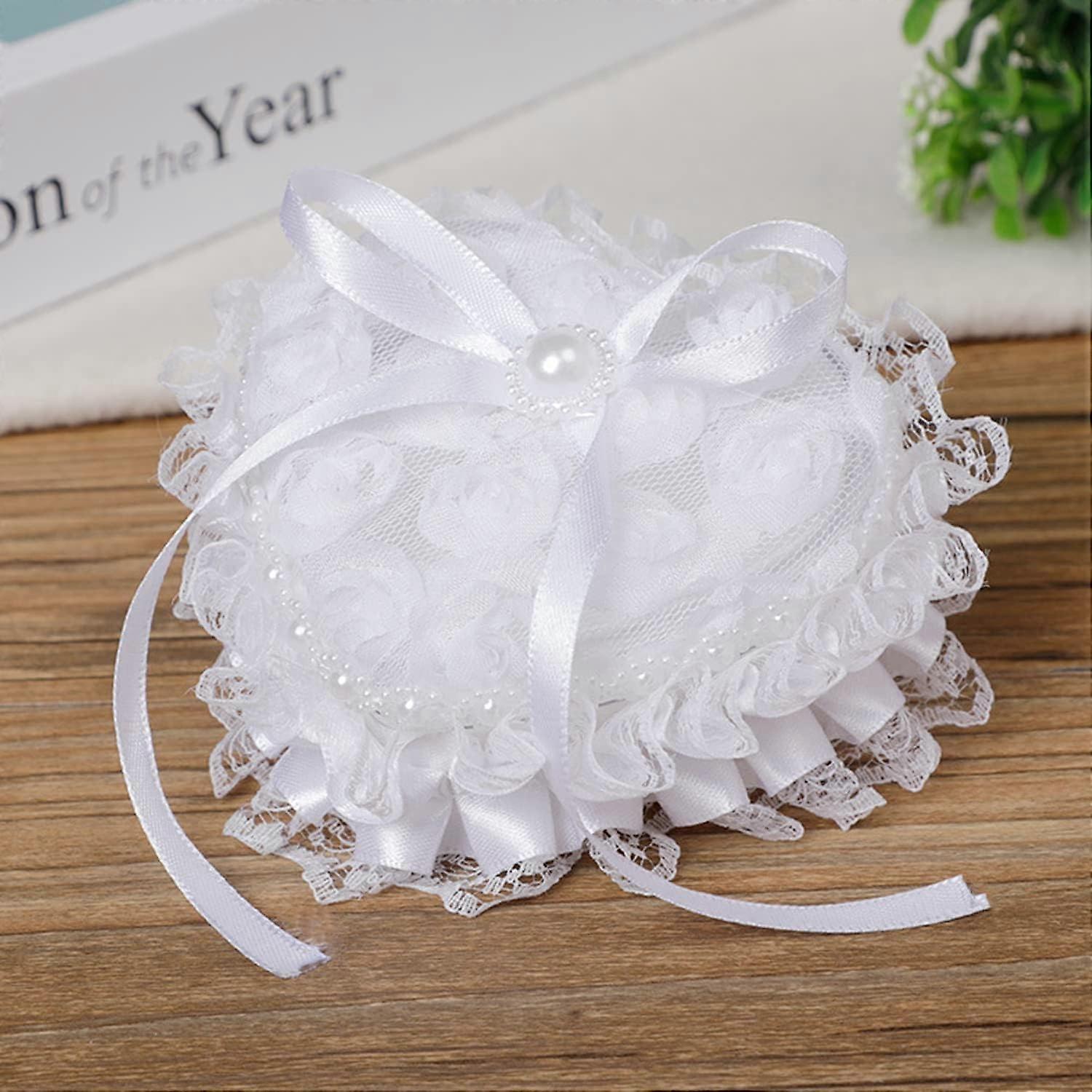 Wedding Ring Pillow Heart Box, White Romantic Lace Pearl Ring Box Holder with Ribbon for Wedding Ceremony Ring Bearer, 3.1''x3.5''x1.8'' Pearl 3.1x