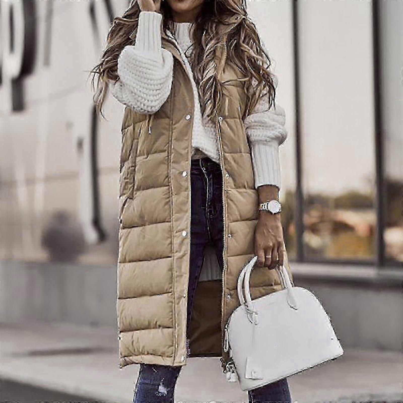 Women's Solid Color Hooded Single-breasted Mid-length Padded Vest Sleeveless Pocket Jacket w