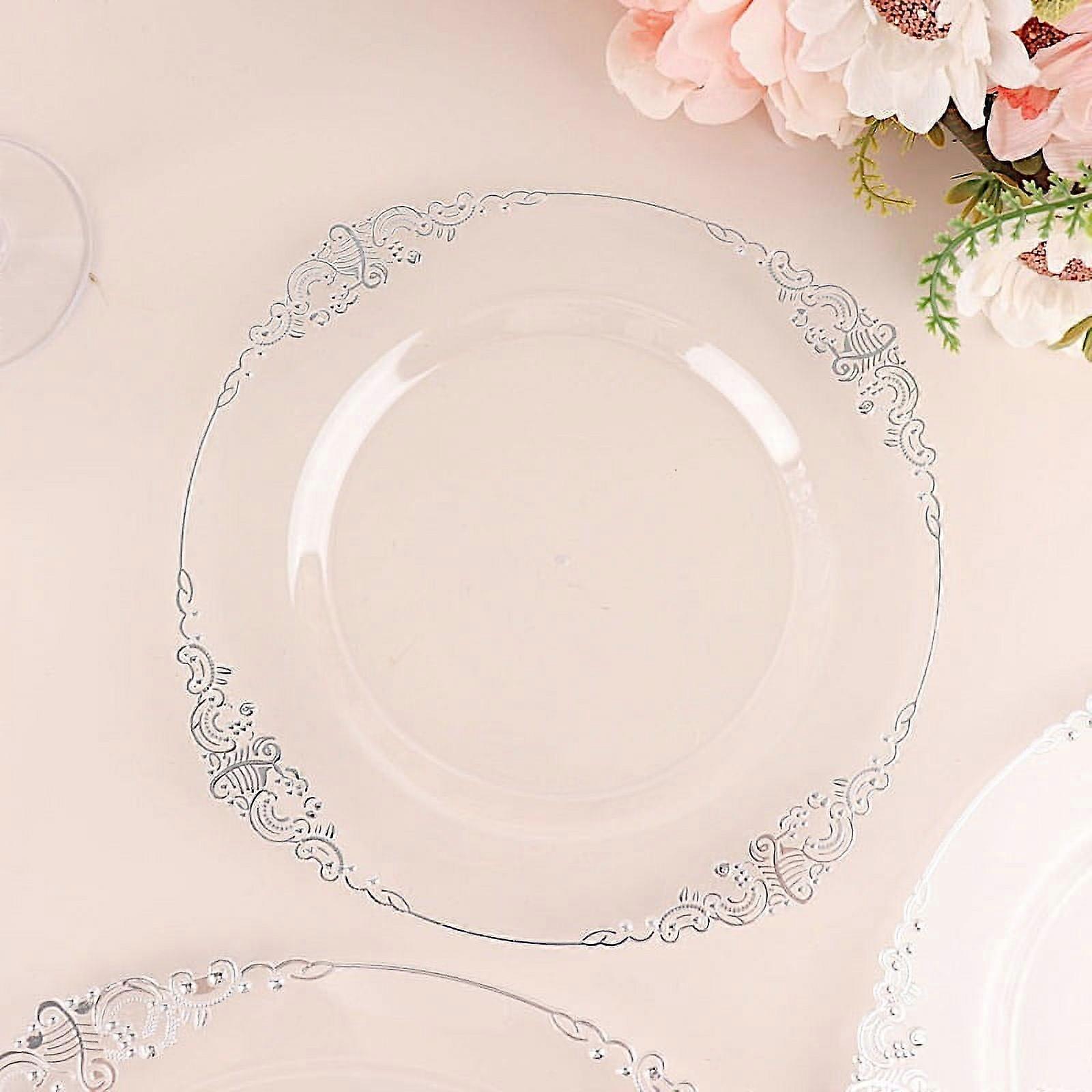 BalsaCircle 10 Clear Round 8" Disposable Plastic Salad Dinner Plates Silver Embossed Baroque Trim Party Events Decorations
