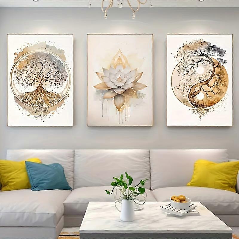 3pcs Art Deco Canvas Posters - Modern Tree of Life & Lotus Flower Prints for Living Room, Bedroom - Indoor Frameless Oil Paintin