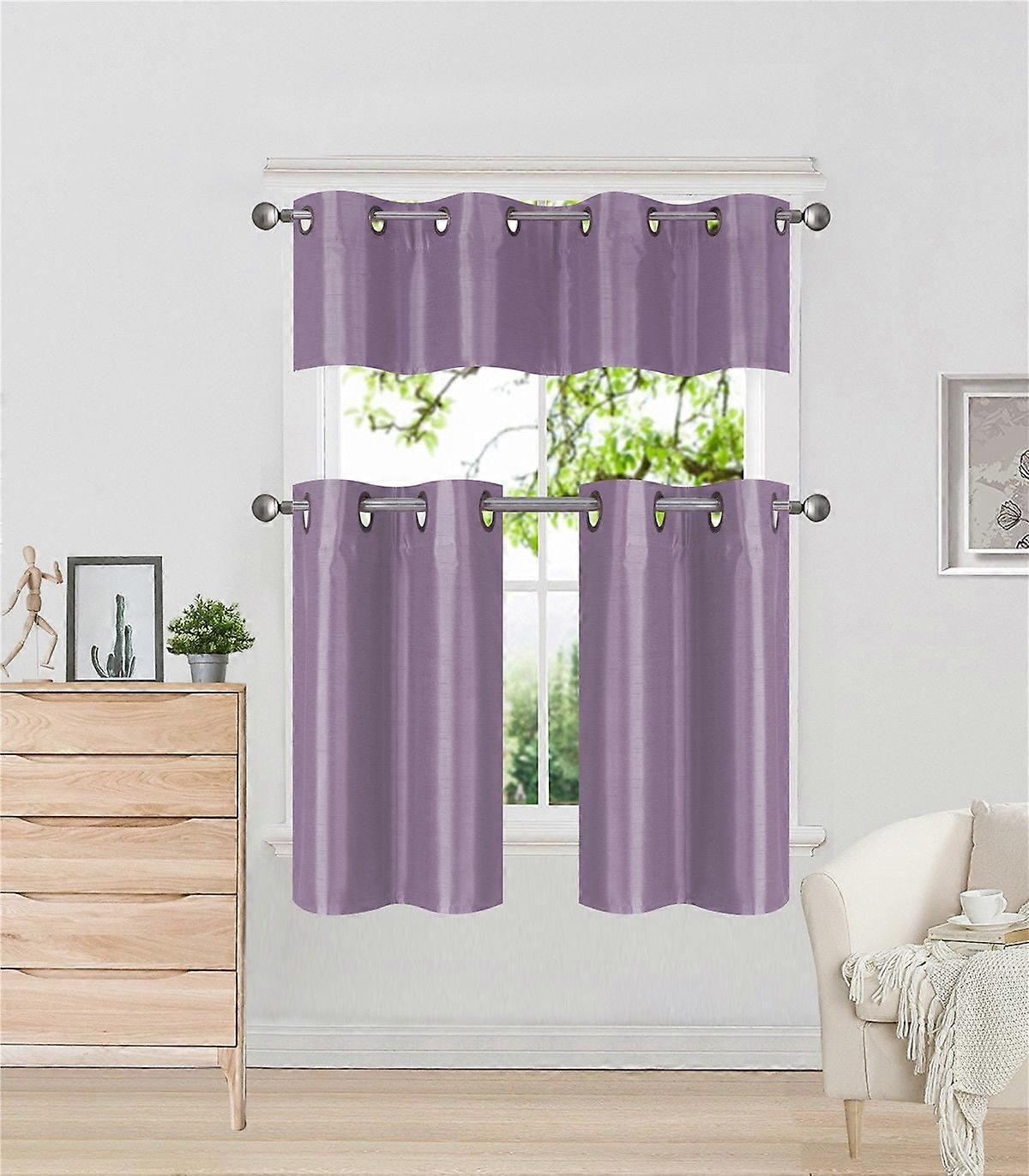 K7 Lilac 3-Piece Faux Silk Blackout Grommet Kitchen Curtain Set, 2 Tiers 28"x24" + 1 Valance 56"x14", Lined