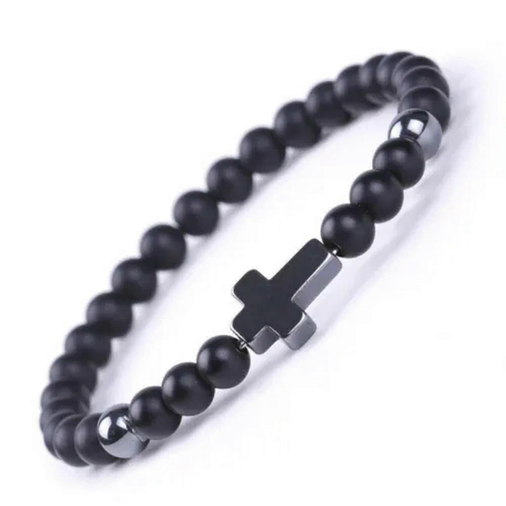 RSAMD Natural Tiger Eye Lava Rock Gemstone 6MM Beaded Cross Bracelets for Men Women-Black Matte-L: 7.6 inch