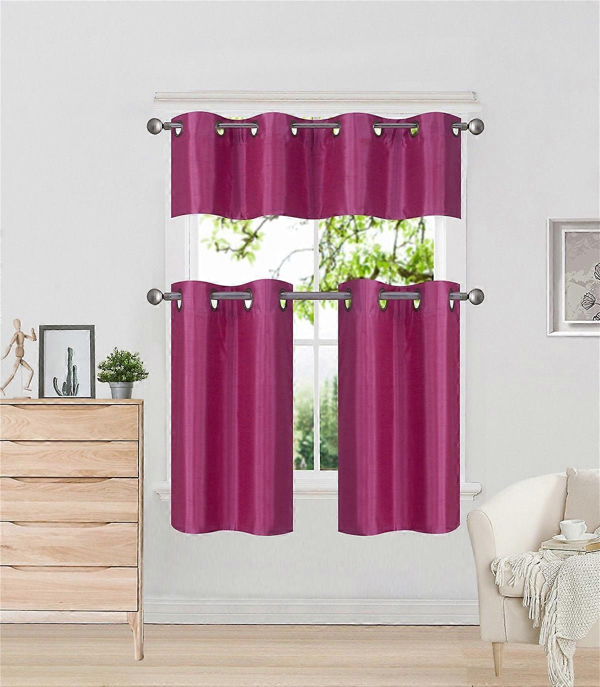 K7 Hot Pink 3-Piece Faux Silk Blackout Grommet Kitchen Curtains - 2 Tiers (28"x24") + 1 Valance (56"x14"), Lined