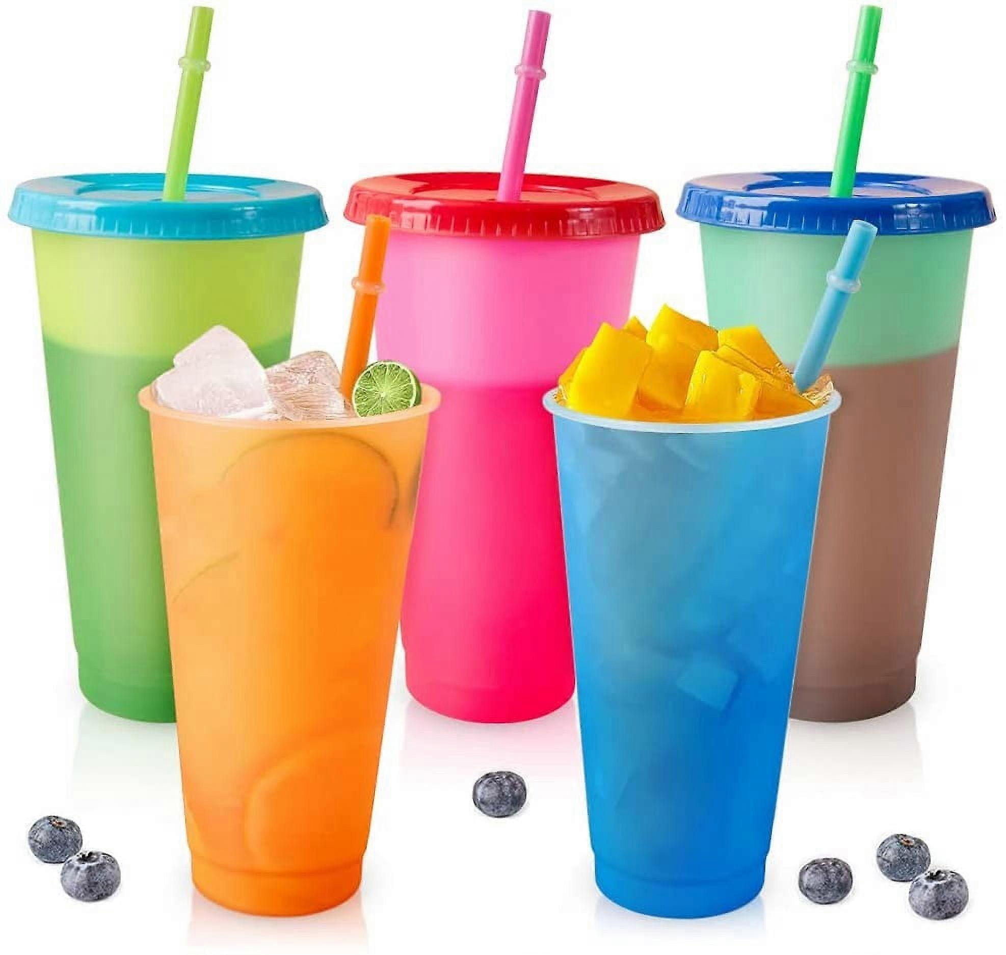 24oz Color Changing Cups, 5pcs Plastic Tumblers with Lids & Straws, Spill-Proof Reusable Cold Drink Cups, Iced Coffee Tumblers for Women