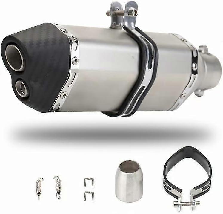 Universal Motorcycle Exhaust – Stainless Steel with Carbon Fiber Tip • Compatible with most motorcycle models for easy, hassle fitment. • Constructed from grade stainless steel for longlasting durability and corrosion resistance. • Stylish silver finish combined with a carbon fiber tip delivers both enhanced performance and a modern, end look. • Includes complete mounting hardware kit with springs, brackets, and adjustable clamp for secure installation. • Streamlined aerodynamic design improves exhaust flow while maintaining a sleek, professional appearance. • Duallayer noise reduction technology ensures a balanced sound profile – delivering performance without excessive noise. Benefits and Practical Applications: 1. Ideal for riders upgrading from factory exhausts, providing enhanced performance, reduced weight, and a distinctive appearance. 2. Suitable for sport bikes, cruisers, and touring motorcycles – whether for daily commuting, spirited weekend rides, or longdistance touring. 3. for riders seeking an easytoinstall solution with all required components included, eliminating the need for additional parts or tools. With universal compatibility, construction materials, and thoughtfully engineered design features, this exhaust system is built to meet the needs of riders who demand performance, style, and reliability in one complete package.