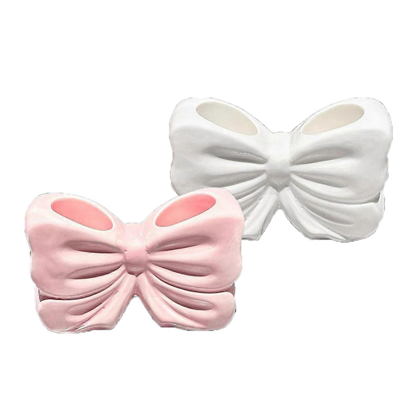 Pink and White Ceramic Toothbrush Holder Set with Elegant Bow Design for Bathroom or Vanity