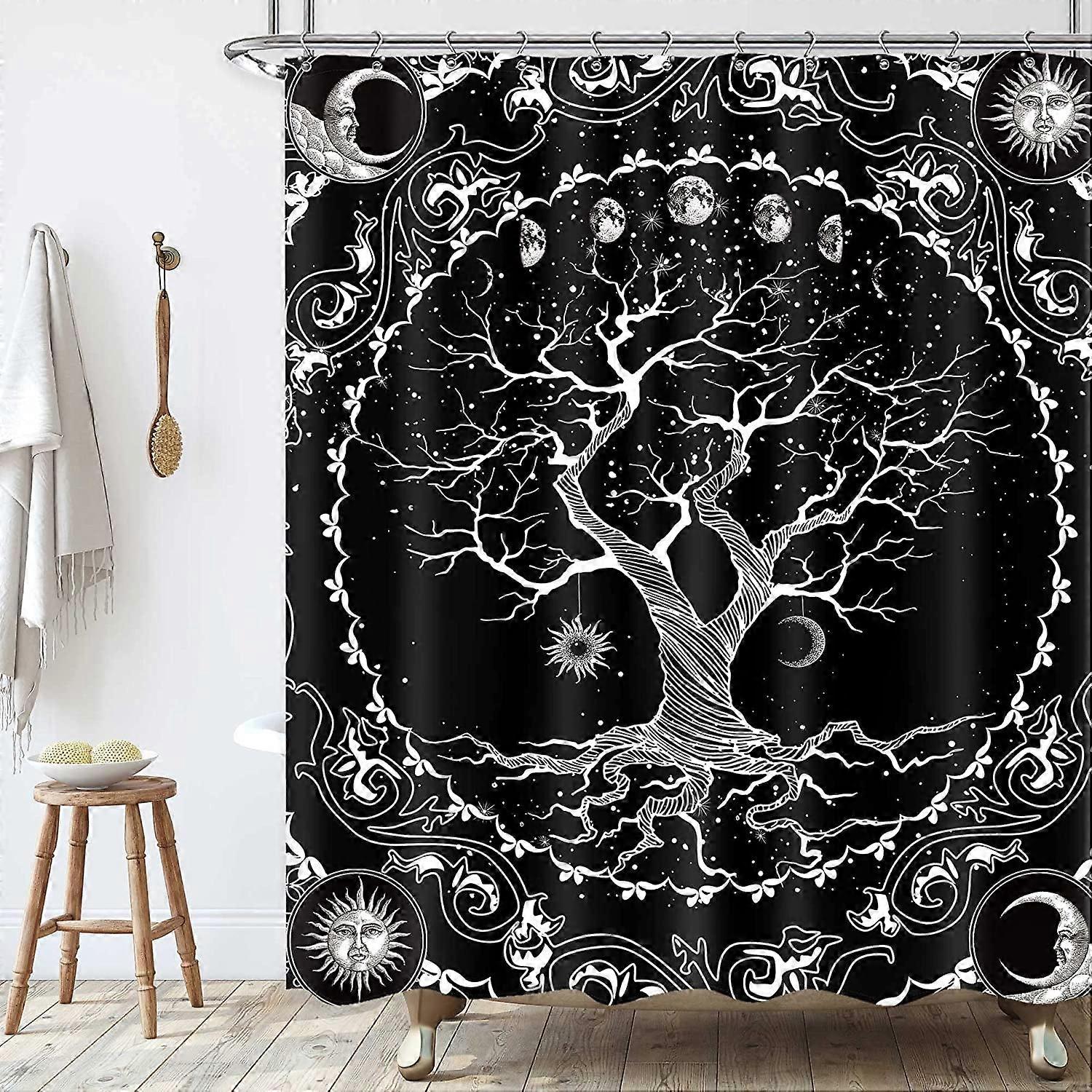 Tree of Life Shower Curtain 60x72 in Black & White Galaxy, Moon Phase, Mystic Bohemian Goth Decor + 12 Hooks