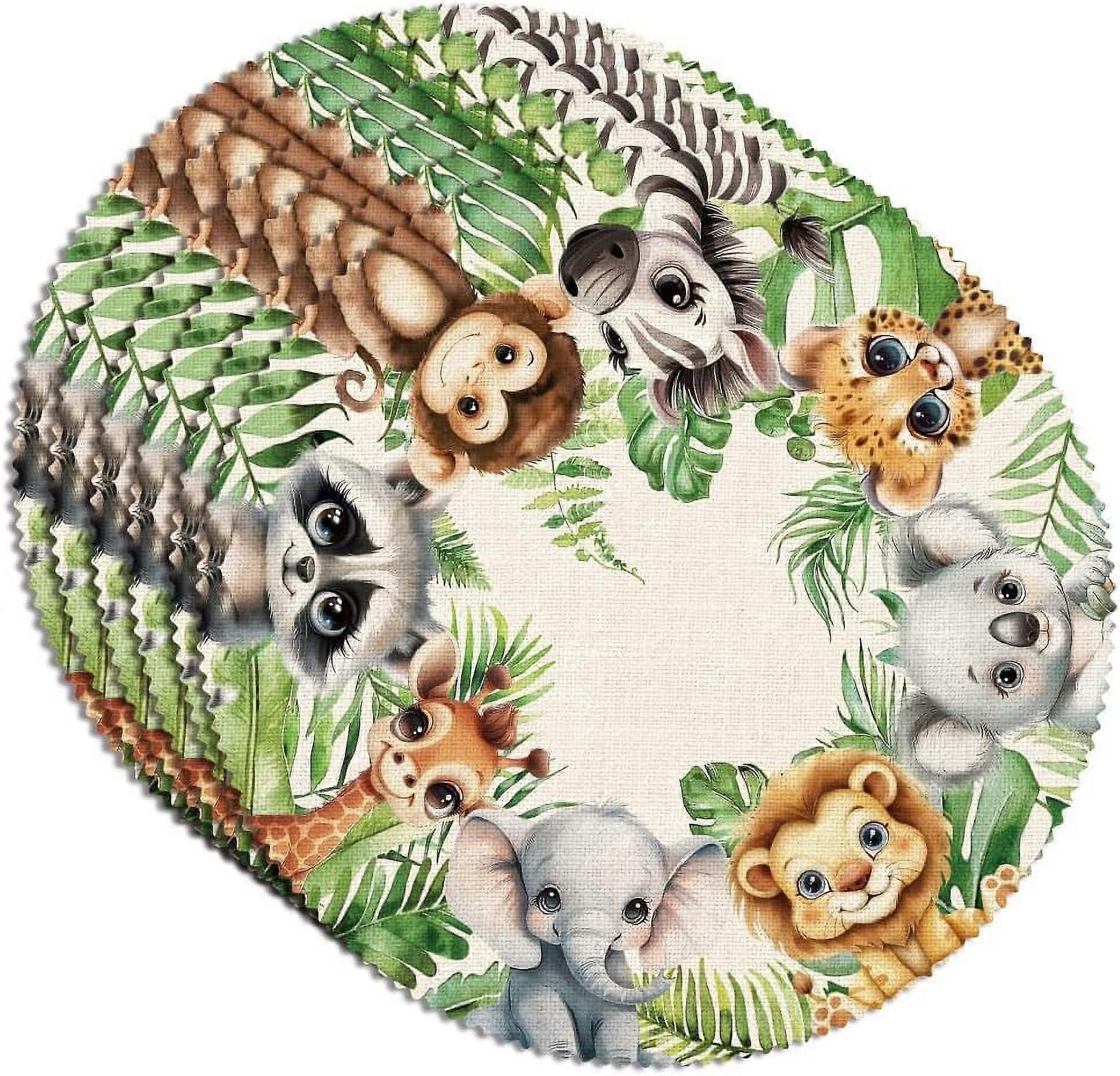 6Pcs 15x15" Round Animal Forest Leaves Table Placemats, Monkey Elephant Design, Polyester Washable Table Cloths for Party, Kitchen, DIY, Spring