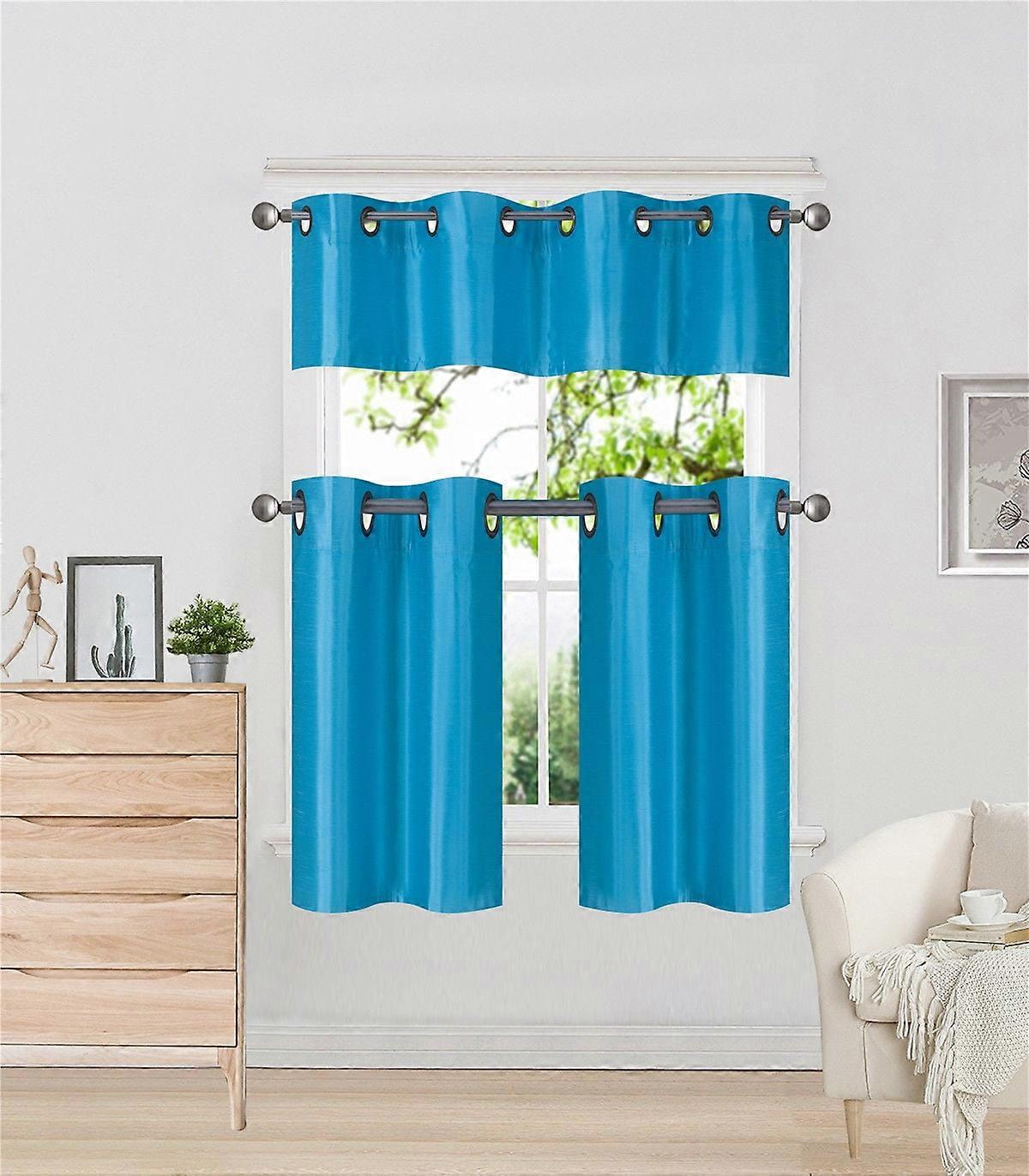 K7 Turquoise 3-Piece Faux Silk Blackout Grommet Curtains Set, 2 Tiers 28"x24" + 1 Valance 56"x14", Lined