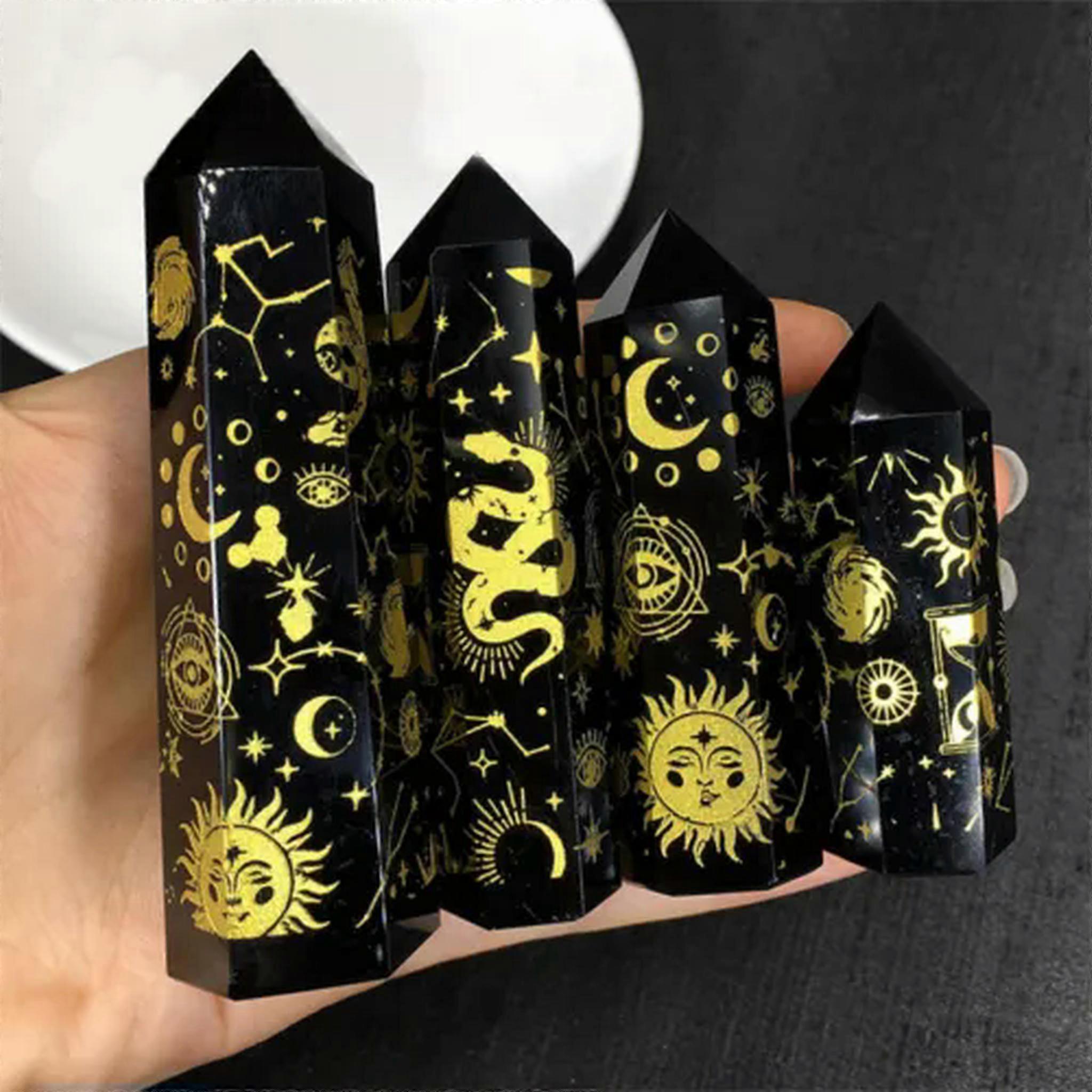 RSAMD Natural Obsidian Quartz Crystal Obelisk Wand Point Hexagonal Prism Reiki Healing-1PC (Random Pick)-Gold-Sun Moon Star (7-8cm)