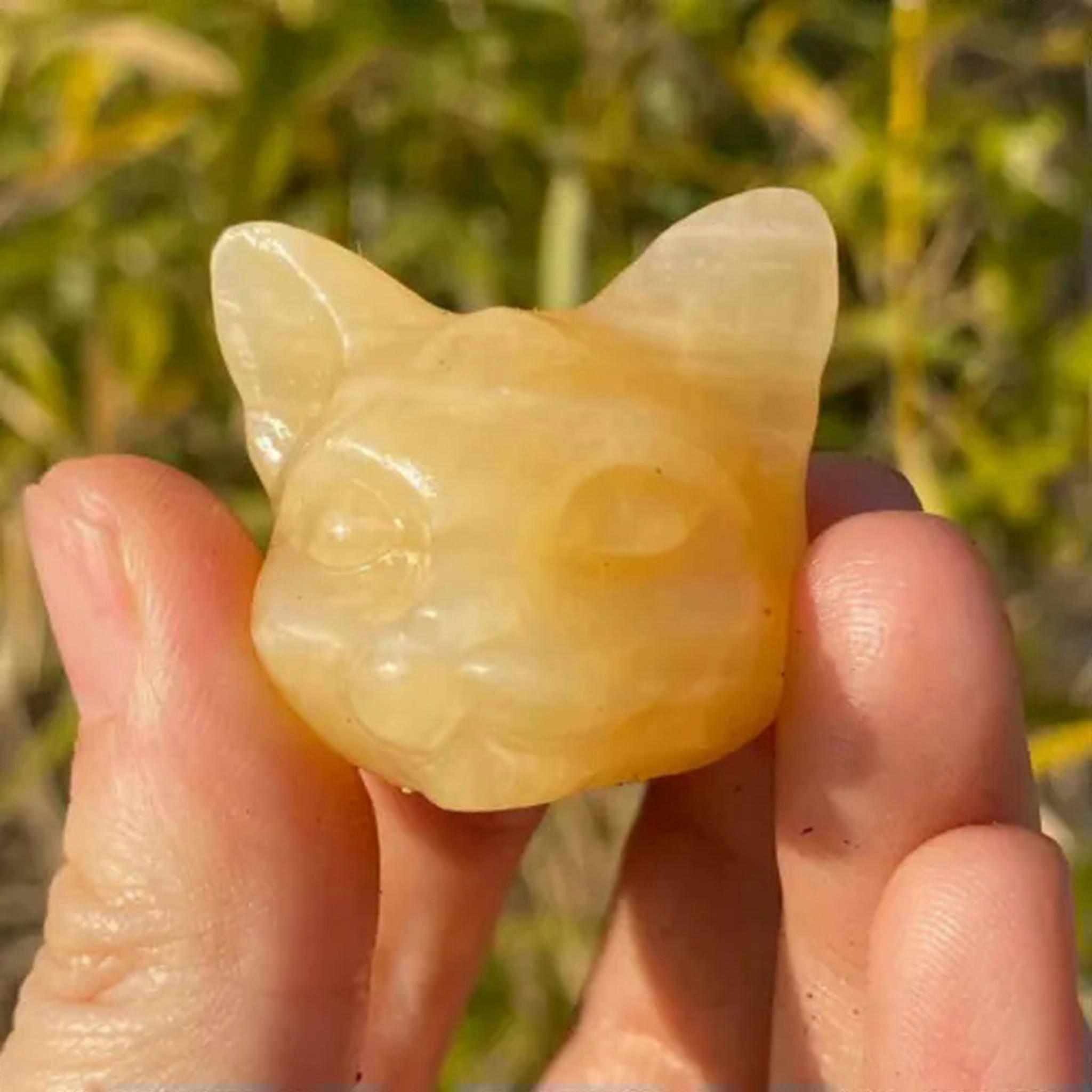 RSAMD Natural Hand Carved Crystal Three-eyes Cat Head Skull Quartz Reiki Figurine Gift-Yellow Calcite-1PC (Random Pick)