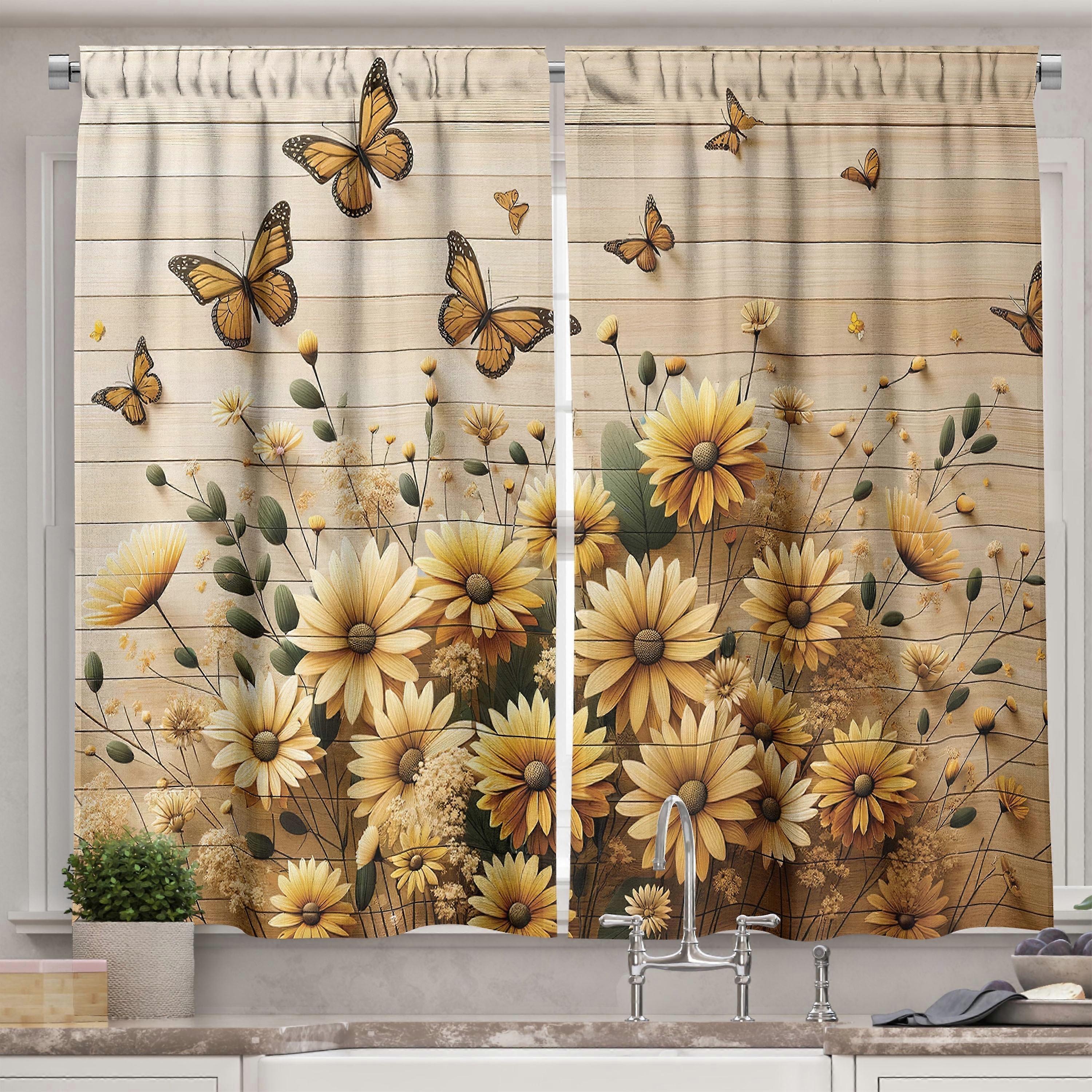 Ambesonne Rustic Kitchen Curtains, Meadow Bloom Butterflies, 55"x45", Pale Orange Tan Green