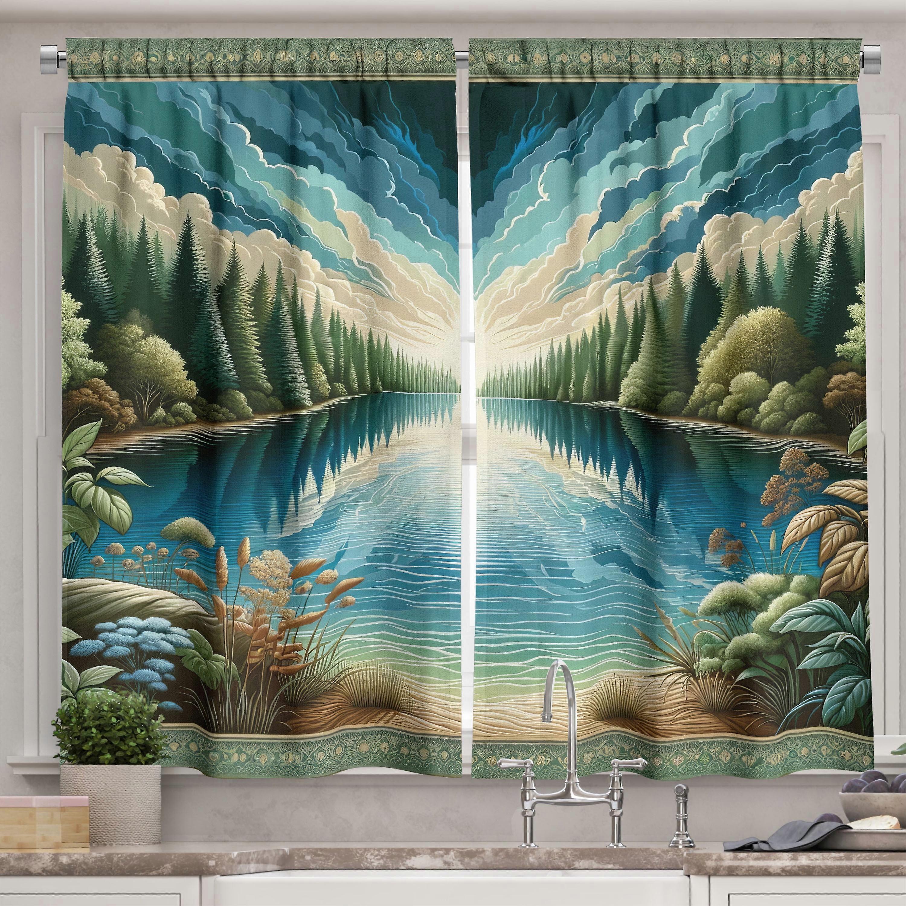 Ambesonne Landscape Kitchen Curtains, River and Forest Symmetry, 55"x24", Green Blue