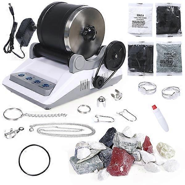 Parts List:1 x Stone Tumbler1 x Roller1 x Stone Bag (optional style and color) (inside the drum)1 x Power Adapter4 x Abrasive1 x Glue1 x Wheel Belt1 x Accessory Bag (1 large key ring, 1 small key ring, 1 necklace, 2 rings, 3 stone buckles, 2 pins)1 x User ManualHighlight [Grind Your Own Gemstones] Rolling stones is a very popular hobby for children and adults. This professional stone polisher makes polishing easier in a fun way and turns rough stones into beautifully polished gemstones.[Easy to Use] You can set any grinding time from 1-7 days with one button, or you can stop and continue working with one button. When the set working time is finished, the stone grinder will stop automatically. The leak-proof rubber jug reduces noise, and the overall noise level is 75% lower than the plastic jug. [Educational and Scientific Toys] Children can collect all kinds of rocks outdoors and grind them into attractive diamonds by machine. During the grinding process, they can cultivate their curiosity and observation, and children can also experience the joy of work. [Durable Polishing Machine] Our polishing machine uses a high-quality motor that is durable and can work continuously for a long time. Suitable for children's DIY activities. [Perfect Gift] This is a science education kit for all genders and ages that develops a love of science, geology and mineralogy in a fun and exciting way. Perfect for birthday, Christmas and other holiday gifts. Detailed Name: Rock Tumbler Kit Product Material: ABS, Metal Product Size: 2114,516.6cm Applicable Age: 8+ Voltage: 100-240V Color: Black Notes: 1. Due to the difference between light and screen settings, the color of the item may be slightly different from the pictures. 2. Please allow slight dimension deviation due to manual measurement. [Grind Your Own Gemstones] Rolling stones is a very popular hobby for children and adults. This professional stone polisher makes polishing easier in a fun way and turns rough stones into beautifully polished gems. [Easy to use] You can set any grinding time from 1-7 days with one button, or you can stop and continue working with one button. When the set working time is finished, the stone grinder will stop automatically. The leak-proof rubber jug reduces noise, and the overall noise level is 75% lower than the plastic jug. [Educational and scientific toys] Children can collect all kinds of stones outdoors and grind them into attractive diamonds by machine. During the grinding process, they can cultivate their curiosity and observation, and children can also experience the joy of work. [Durable Polisher] Our polisher uses a high-quality motor that is durable and can work continuously for a long time. Suitable for children's DIY activities. [Perfect Gift] This is a science education kit for all genders and ages that develops a love of science, geology and mineralogy in a fun and exciting way. Perfect for birthday, Christmas and other holiday gifts.\" When shopping, please pay attention to the size and dimensions of the product to ensure that it meets your needs. In the title and description, we have provided detailed information about the product, including its features and specifications. We want you to be completely satisfied with your purchase, so if you have any questions or concerns, please do not hesitate to contact us. We are here to help and do our best to help you. Thank you for choosing our product. We hope you like it!