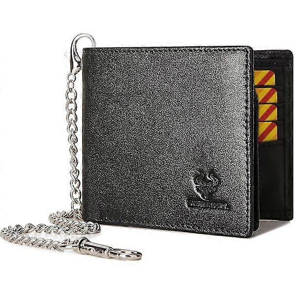 Men's Wallet with Chain Genuine Leather Wallet RFID Blocking Bifold Wallet with ID Window Card Slots, Black