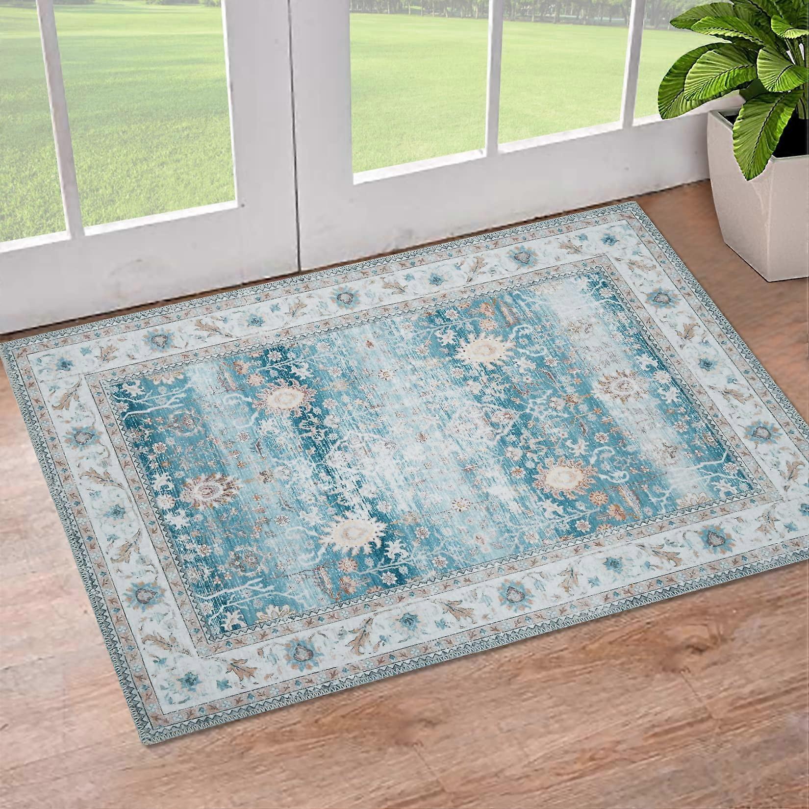 Blue Floral Distressed Area Rug, Machine Washable & Non-Slip, Foldable Boho Chic Rug for Bedroom, Living Room, Entryway