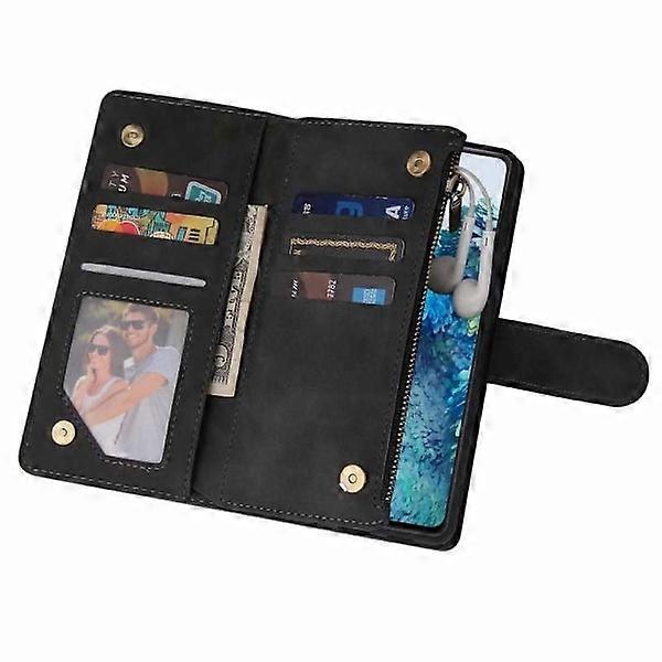 Multifunctional wallet case with a total of 8 compartments. 6 of these are ideal for bank cards and the like, one of which also has a window for ID cards or photographs. Another compartment is ideal for banknotes and receipts. What sets this case apart from other wallet cases, however, is the last compartment that closes with a zipper. This spacious compartment can store banknotes, receipts, coins, headphones, gift cards, stamp cards and so on, without the risk of anything falling out. By using our mobile phone case, you also protect your valuable mobile phone and minimize the risk of damage if you happen to drop, scratch or bump it against something. The case is made of high-quality artificial leather with an exclusive surface that is comfortable both to hold and to look at. Perfect for all occasions, both on the go, at work and at home. The phone is held in place by a custom frame made of silicone and the case is easily opened and closed with a magnetic lock. The middle section closes with magnetic buttons and the back of the credit card slots has a smooth surface that protects your display. The design also makes it possible to use the case as a stand for hands-free viewing of movies and videos. Features: - Total of 8 compartments: - 5 credit card slots. - 1 compartment with window for ID cards. - 1 compartment for banknotes/receipts. - 1 large compartment with zipper for small items - Material: Black PU leather - Wrist strap included - Fits: compatible with Samsung Galaxy S20 FE [8-Compartment] Multifunctional wallet case with a total of 8 compartments. 6 of these are ideal for bank cards and the like, one of which also has a window for ID cards or photographs. Another compartment is ideal for banknotes and receipts. What sets this case apart from other wallet cases, however, is the last compartment that closes with a zipper. This spacious compartment can store banknotes, receipts, coins, headphones, gift cards, stamp cards and so on, without the risk of anything falling out. [Number of Compartments] A total of 8 compartments: - 5 credit card compartments. - 1 compartment with slots for ID cards. - 1 large compartment with zipper for small items. [Construction] The phone is held in place by a custom frame made of silicone and the case opens and closes easily with a magnetic lock. The part in the middle closes with magnetic buttons and the back of the credit card compartments has a smooth surface that protects your display. The construction also makes it possible to use the case as a stand for hands-free viewing of films and videos. [Protective Case] By using our mobile case, you also protect your valuable mobile phone and minimize the risk of damage if you happen to drop, scratch or bump it against something. The case is made of high-quality artificial leather with an exclusive surface that is comfortable to hold and look at. Perfect for all occasions, whether on the go, at work or at home.