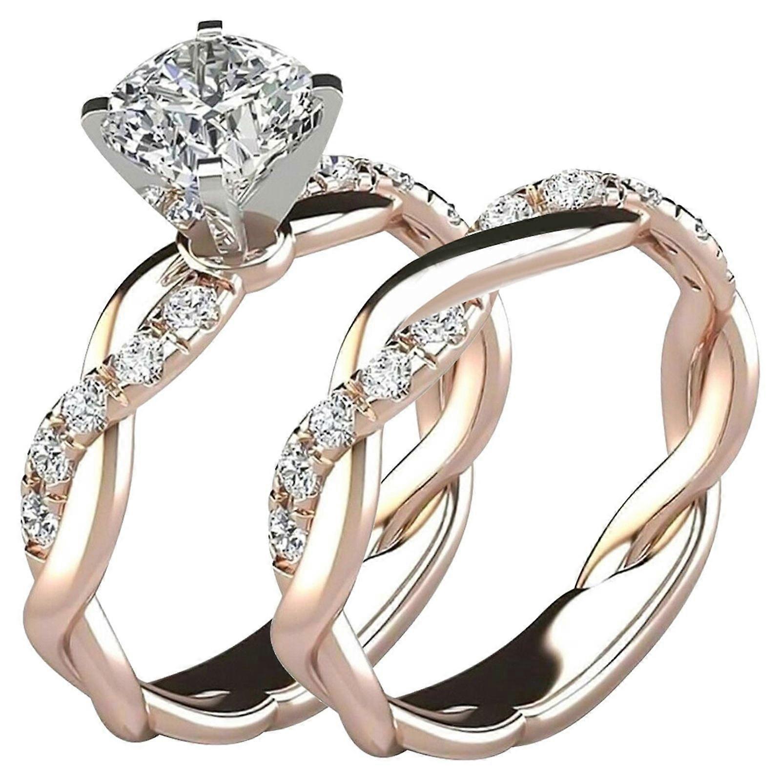 EQWLJWE Cubic Zirconia Engagement & Wedding Ring Set, Size 5-10, 14K Rose Gold, 2-Count