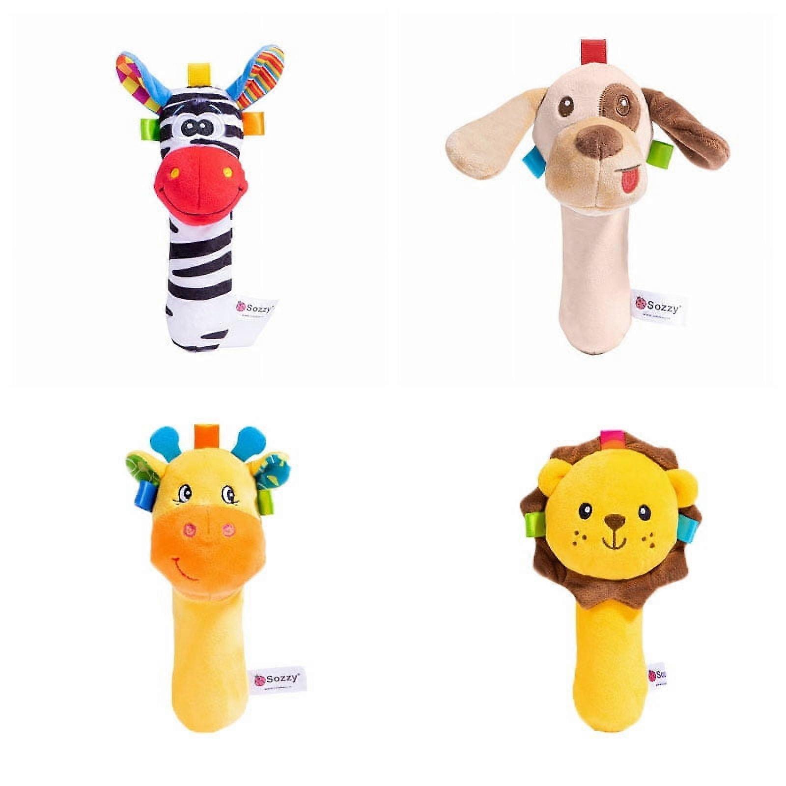 JANDEL 2 Pack Cartoon Stuffed Animal Baby Soft Plush Hand Rattle Squeaker Sticks for Toddlers - Lion, Zebra, Giraffe, Dog