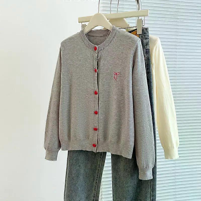 Autumn Winter 2025 Korean Casual Solid Tops Women O-Neck Single Breasted Heart Button Sweater Bow Embroidery Knitted Cardigan