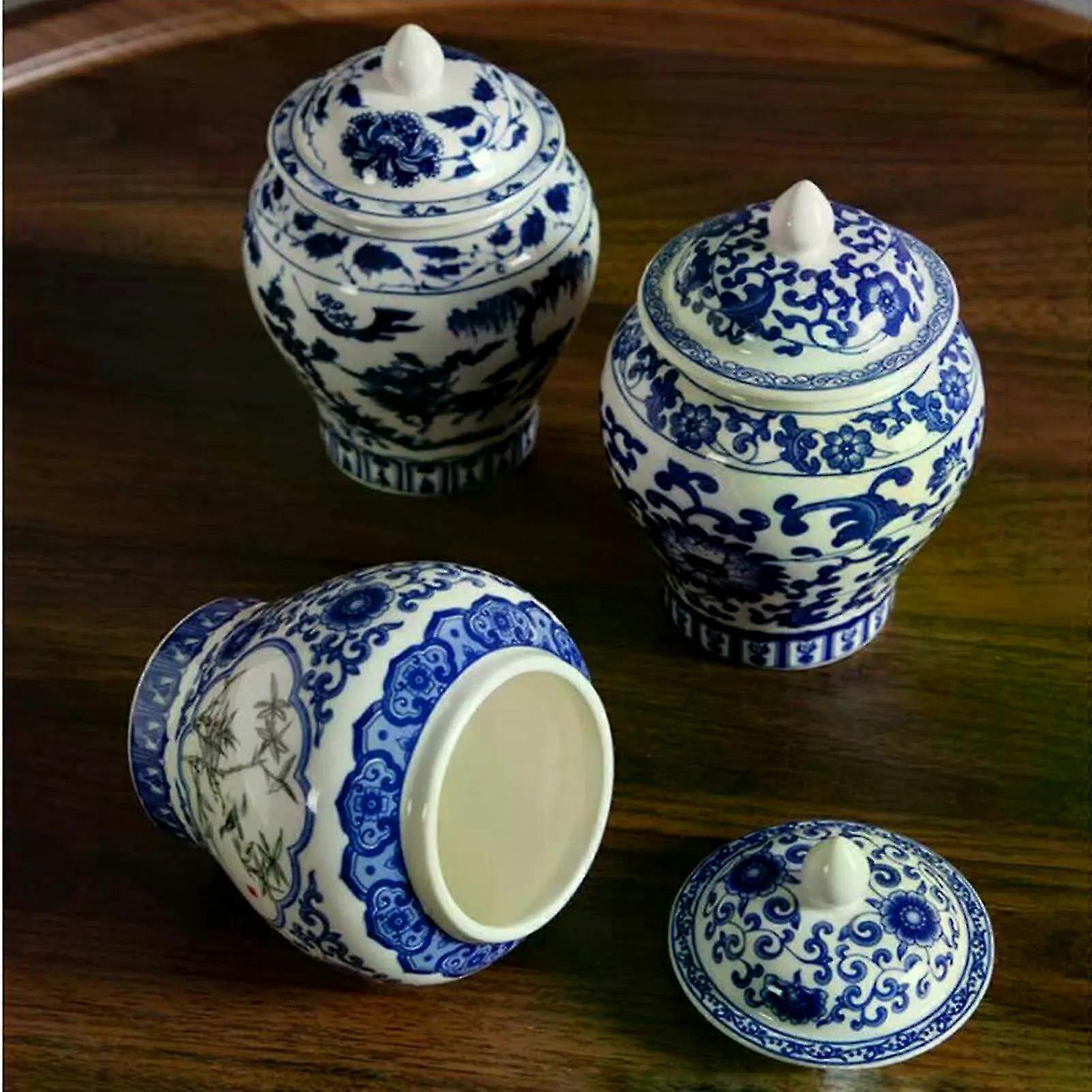 Chinese Ceramic Ginger Jar Decorative Flower Vase With Lid Blue And White Porcelain Jar For Restaurant Decor Ornament