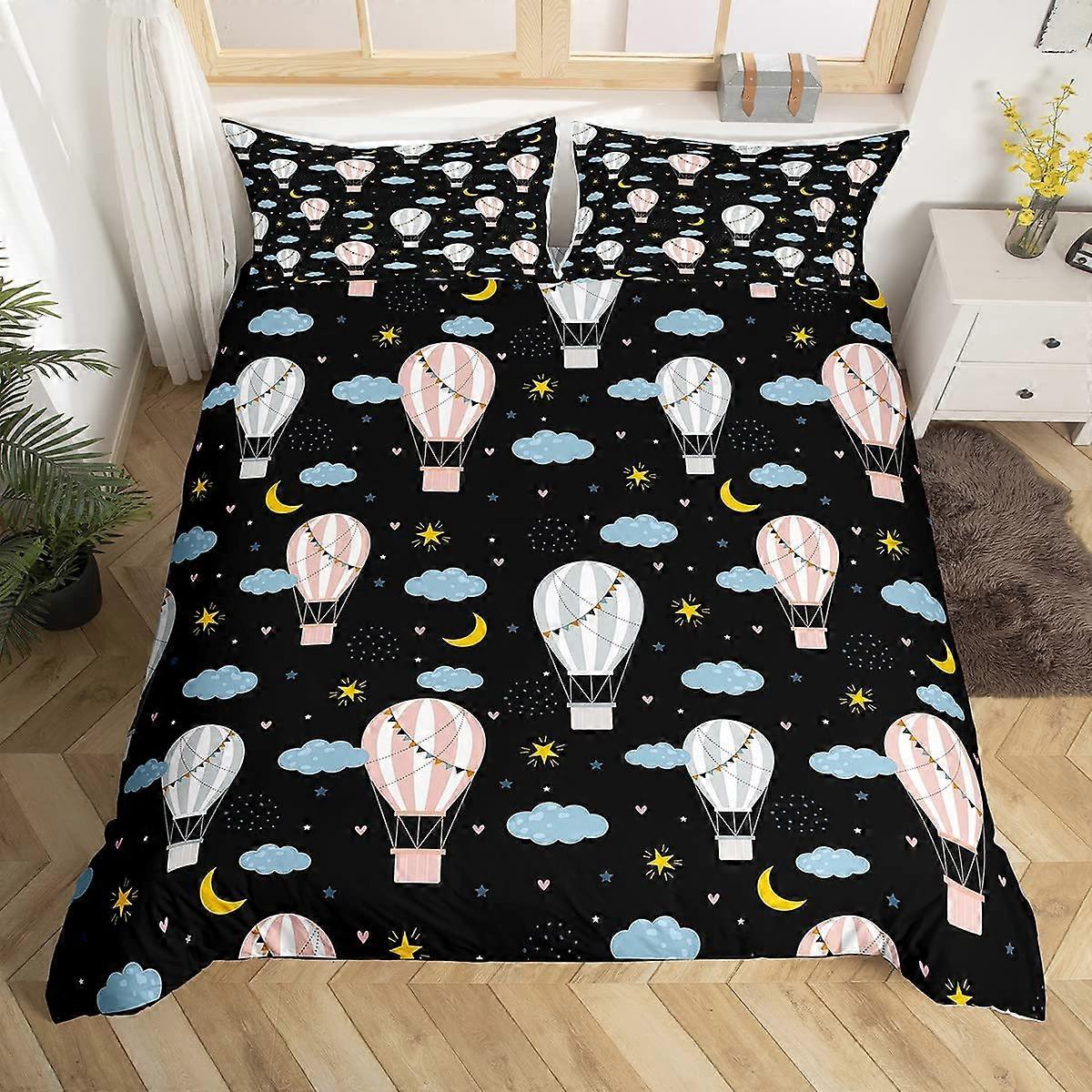 1-Hand Painted Style Balloon Duvet Cover - Floating Hot Air Balloons with Clouds & Moon Print, Available in Twin and King Sizes