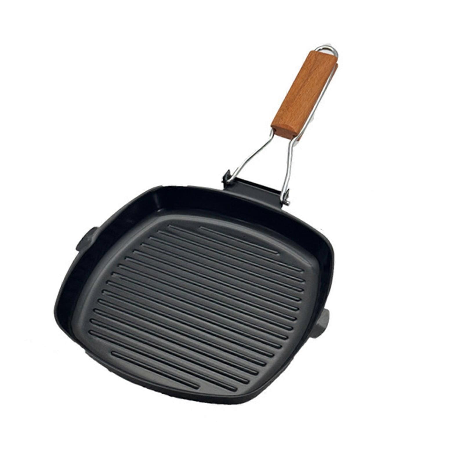 Leke Frying Pan Foldable Grill Pan Steak Anti-scald Wooden Handle Portable 2 Mouth